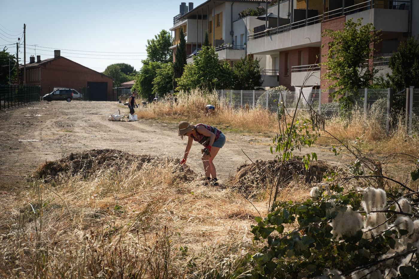 La chaleur est encore écrasante en cette fin de journée du début du mois de juin. Un petit groupe s'affaire doucement à ramasser détritus et vieilles carcasses de chaise qui jonchent le sol poussiéreux de ce qui était, il y a encore quelques jours, un parking délabré. Cette parcelle en friche, autrefois maraîchère, située dans le quartier prioritaire des Izards-Trois Cocus à Toulouse, fait l'objet d'un projet pilote mené par une toute jeune association, Pousses Ô Abris. Cette dernière envisage d'y installer une pépinière avec l'aide de citoyens concernés et d'habitants du quartier. Un retour à la terre en somme. Avant les premières semences de plantes sauvages comestibles et d'angrais verts, il s'agit de nettoyer la parcelle et d'étaler 90 tonnes de broyat végétal pour rendre le sol à nouveau fertile.
