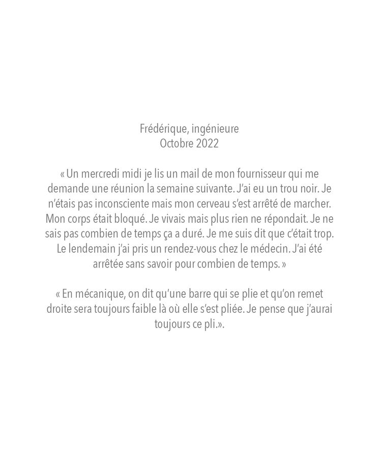 Cette série de portraits s’intéresse au récit de personnes en situation de burn-out. Terme parfois galvaudé, le « syndrome d’épuisement professionnel » correspond à un ensemble de symptômes physiques et psychiques, et ses manifestations ont dans la grande majorité des cas des répercussions jusque dans la vie privée de la personne. Difficile à quantifier car non-reconnu comme maladie professionnelle, le burn-out concernerait 5 à 10% de la population active en France. Au-delà des facteurs qui ont conduit au burn-out, ces témoignages sont marqués par un point de rupture, un basculement, celui du jour où ces salariés et ex-salariés ne sont plus retournés sur leur lieu de travail. Cette série pose en outre la question du bien-être du salarié, et tente d’interroger son rapport au travail et la place que ce dernier occupe aujourd’hui dans nos sociétés.