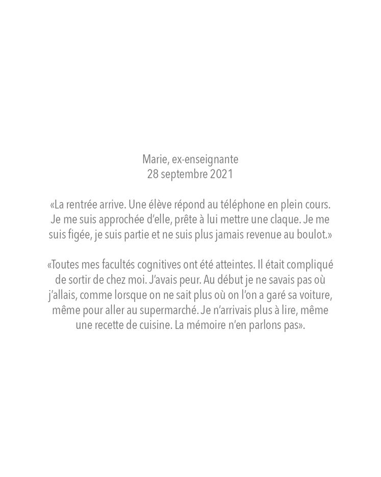 This series of portraits focuses on the stories of people suffering from burn-out. Sometimes overused, the term “burn-out syndrome” refers to a set of physical and psychological symptoms, and in the vast majority of cases its manifestations have repercussions that extend into the person's private life. Difficult to quantify, as it is not recognized as an occupational disease, burn-out is thought to affect between 5% and 10% of the working population in France. Over and above the factors that led to burn-out, these testimonies are marked by a breaking point, a tipping point, the day when these employees and ex-employees no longer returned to their workplace. The series also raises the question of employees' well-being, their relationship with work and the place it occupies in today's society.
