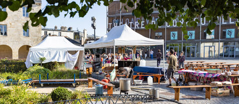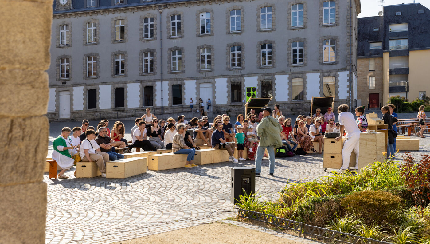 Théatre de rue, le collectif "fête ensemble", une branche du collectif d'artistes-militants écologistes "le bruit qui court" se produit devant le théâtre de Cornouaille à Quimper. En tournée à vélo dans plusieurs villes de Bretagne en Juillet et en Août, chaque représentation est suivie d'un temps d'échange accompagné entre spectateurs et spectatrices pour parler des problématiques environnementales, sociales et des enjeux de coopération décrites par la pièce, le tout suivi d'une soirée dansante ouverte à tous.