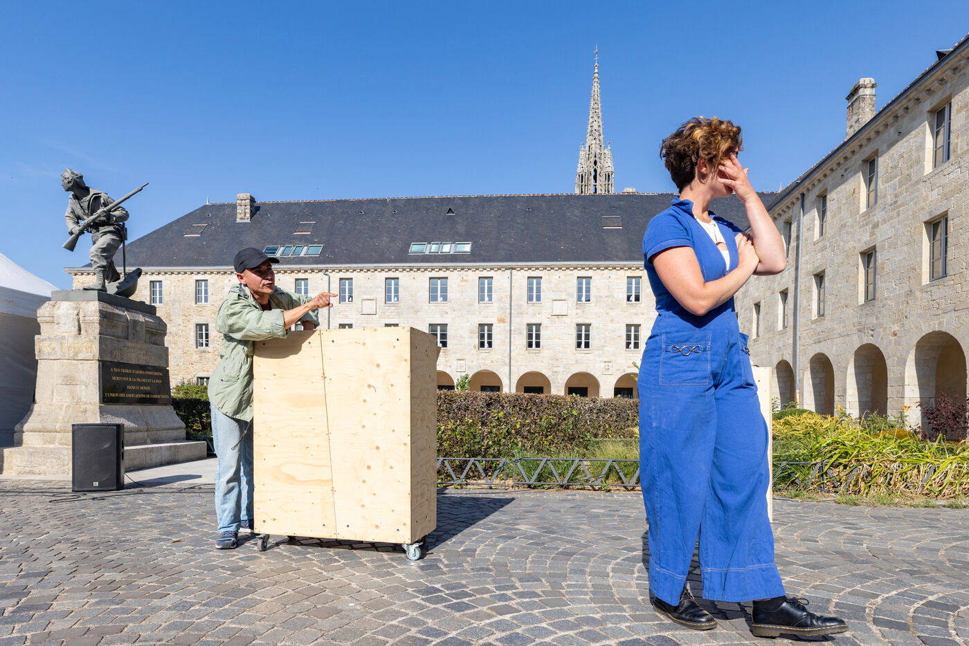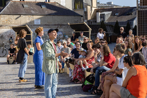 Street play, the collective fête ensemble, branch of the ecologist-artist-activist collective le bruit qui court, performs on a square in Quimper, in front of the Cornouaille theatre. On tour by bicycle in several towns in Brittany in July and August, each performance is followed by a discussion between spectators about the environmental, social and cooperation issues described in the play.