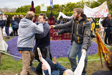 Environmental activists denounce Kaandorp's intensive use of pesticides and water grabbing. Kaandorp is a bulb and flower production company that has been based in Plomeur, Pays Bigouden, since 1980. The event took place during the Flower Festival, which attracts thousands of visitors every year in early spring. The managers of the Kaandorp company violently attacked the demonstrators, provoking several scuffles among the visitors.