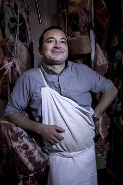 Portrait de Christophe Dru, artisan-boucher. Il tient la Boucherie des Provinces, boucherie-restaurant dans le XIIe arrondissement de Paris, aux abords du marché d'Aligre.