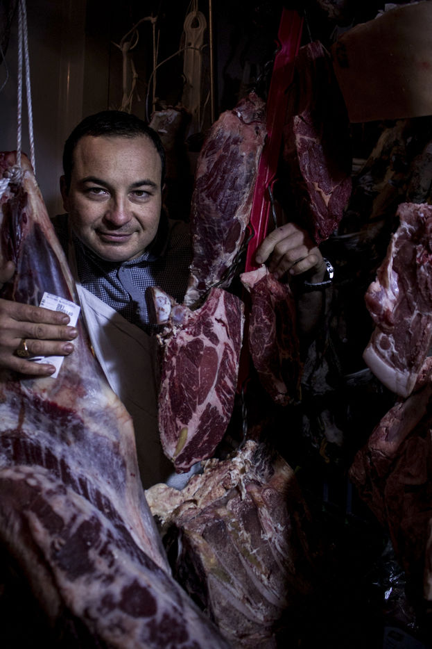 Portrait of Christophe Dru, butcher craftsman. He holds the Boucherie des Provinces, butcher-restaurant in the 12th district of Paris, near the Aligre market.