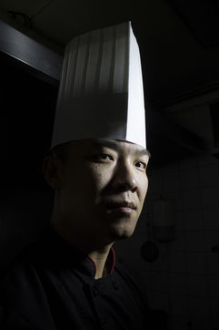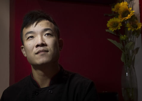 Portrait de Jian GUAN, restaurateur aux abords du marché d'Aligre à Paris, dans le XIIe arrondissement. Jian, ancien légionnaire, pose dans les cuisines de son restaurant, "chez Guan" (ex Fashion Delices) où il réalise ses recettes du nord de la Chine.