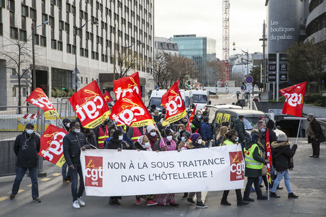 FRANCE, Paris, le 10 Decembre 2020. Le syndicat CGT-HPE appelait a se rassembler pour protester contre les suppressions d emplois et les accords de performance collective (accords de la loi travail de 2016). Apres plusieurs annonces de licenciements dans le secteur, ils reprochent aux grands groupes hoteliers de profiter de la crise sanitaire pour effectuer des restructurations boursieres et mettre des services en sous traitance dans la securite ou le nettoyage. Cette sous-traitance permettant de disposer, lors de la reprise, de salaries en temp partiel precarises. Un petit cortege compose en partie des femmes de menages de l hotel Ibis des Batignolles, en greve depuis juillet 2019, a manifeste devant quelques grands hotels parisiens.