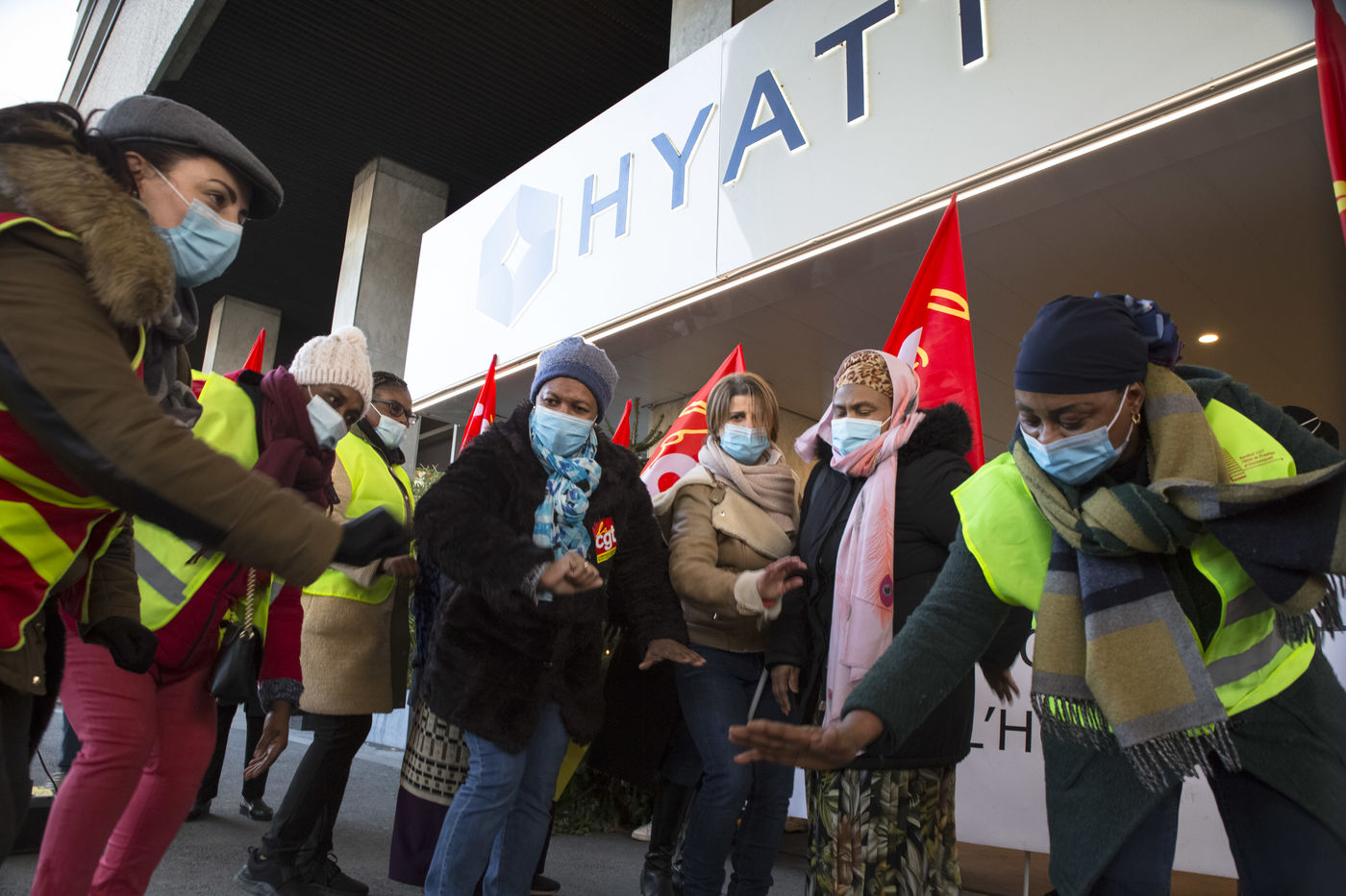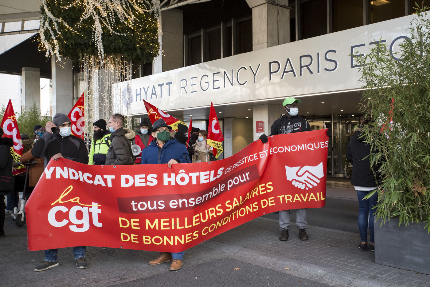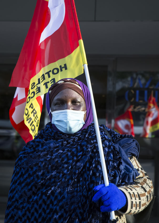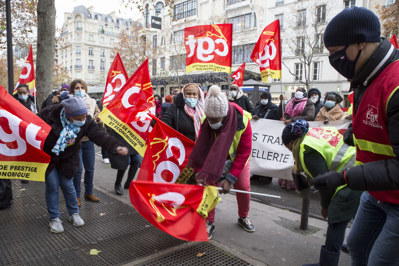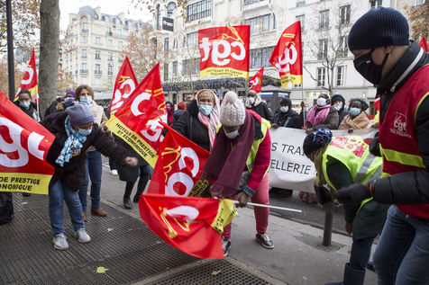 FRANCE, Paris, December 10, 2020. The CGT-HPE union called for a rally to protest against the job cuts and collective performance agreements (2016 labor law agreements). After several announcements of layoffs in the sector, they accuse the large hotel groups of taking advantage of the health crisis to carry out stock market restructuring and outsource services in security or cleaning. This subcontracting makes it possible, during the takeover, to have precarious part-time employees. A small procession composed in part of the housemaids of the hotel Ibis des Batignolles, on strike since July 2019, demonstrated in front of some major Parisian hotels.