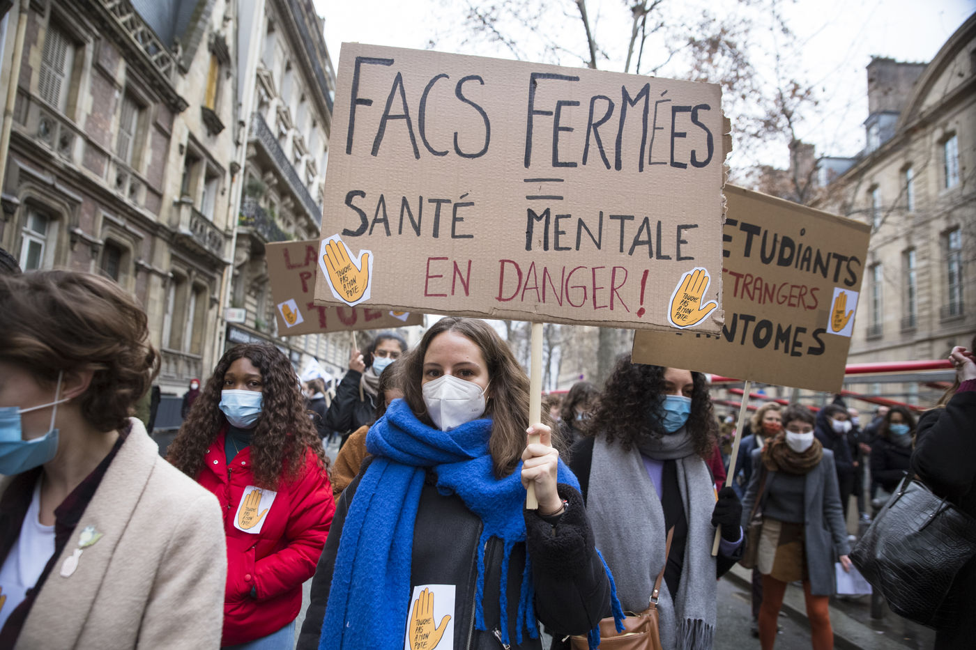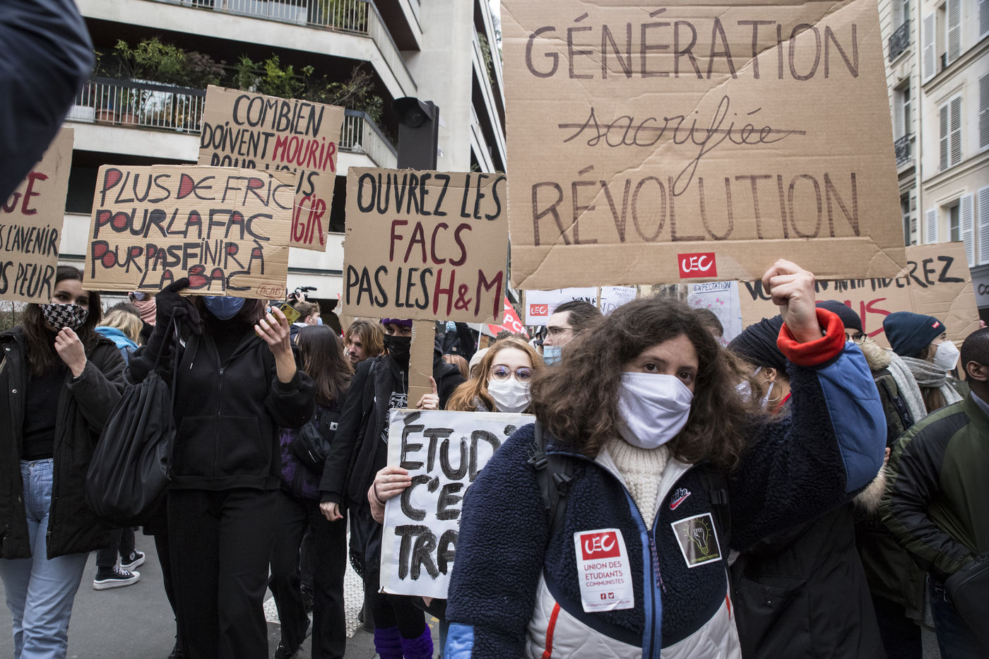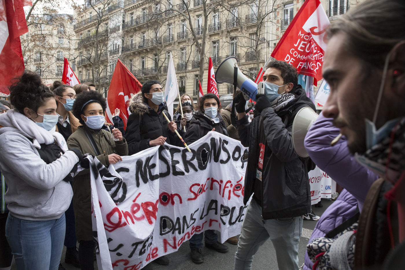 FRANCE, Paris, le 26 janvier 2021. Manifestation intersyndicale (FSU, FO, CGT, SUD, SNLC, Snalc), du personnel de l Education Nationale pour denoncer ses conditions de travail, encore degradees avec la pandemie de Covid-19. Enseigants, etudiants et parents d eleves attiraient l attention sur la precarite et la detresse etudiante dans la gestion de cette crise sanitaire.