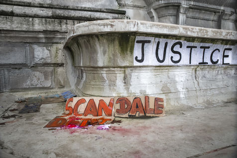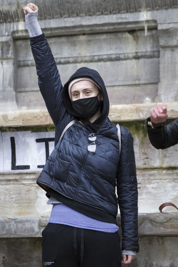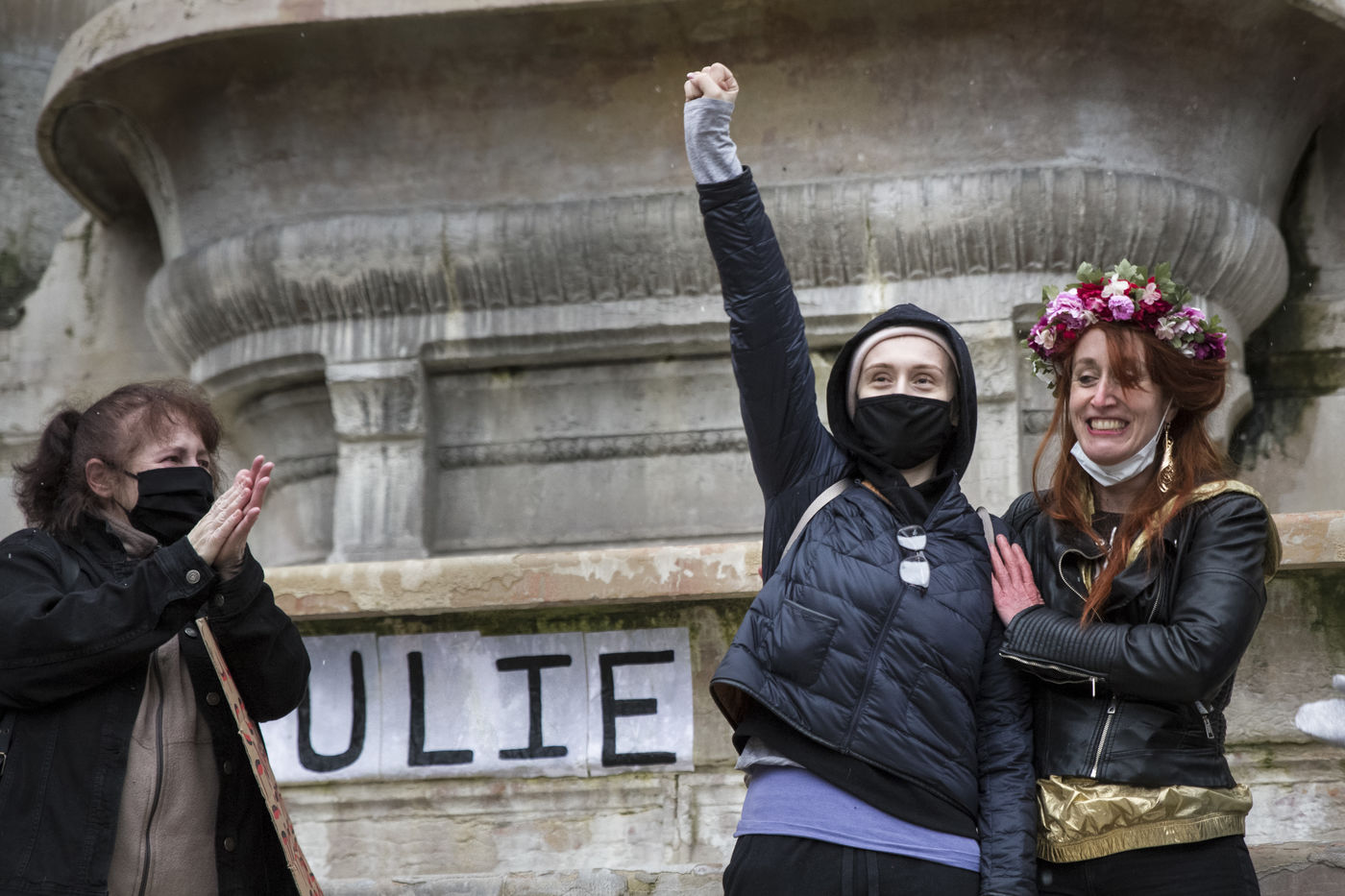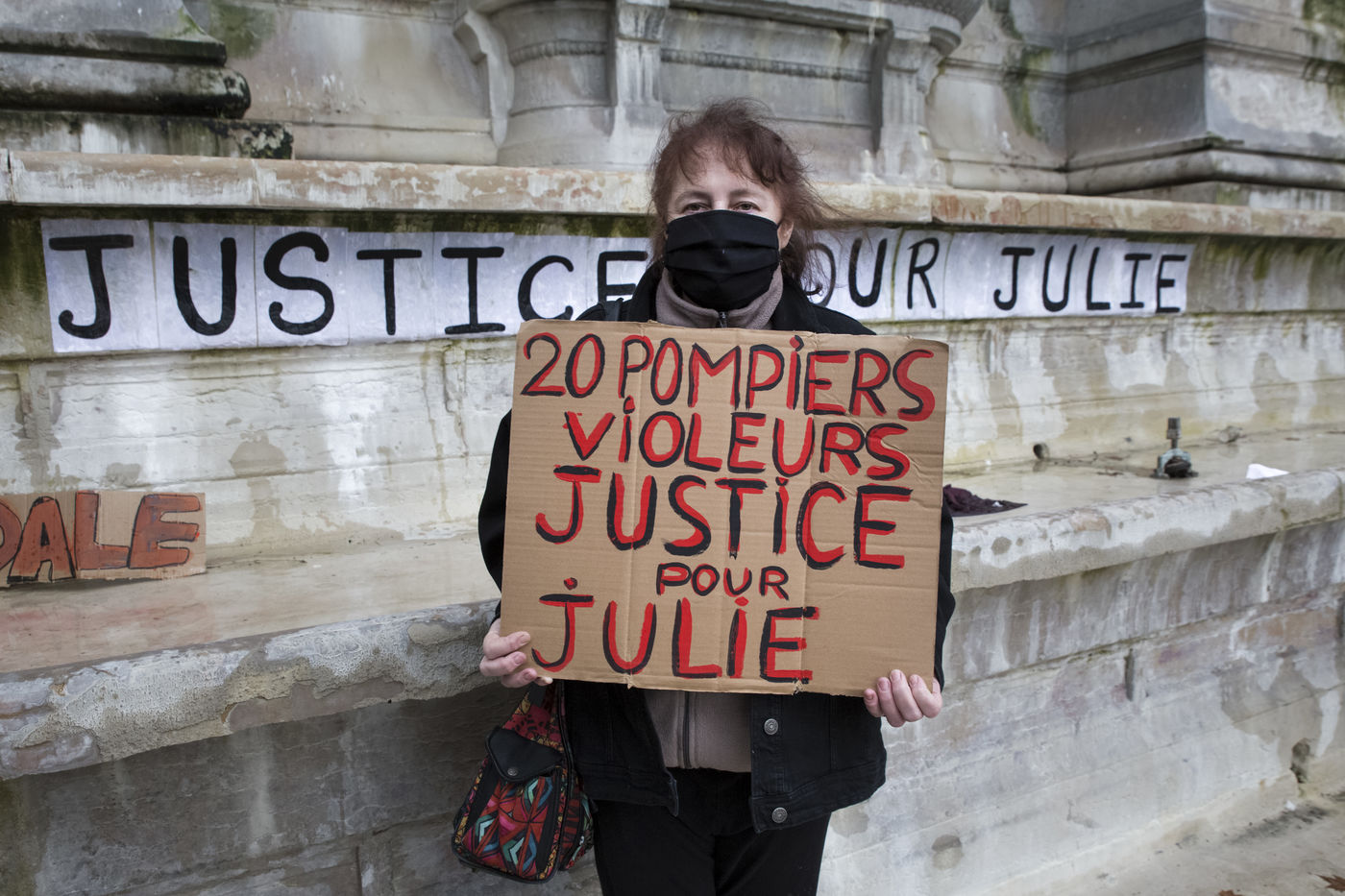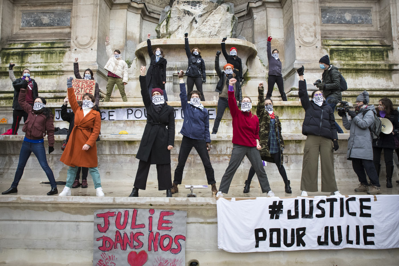 Dimanche 7 fevrier 2021, place Saint-Michel, Paris, France. Rassemblement de soutien a Julie (pseudonyme) avant que son affaire ne soit re-examinee par la Cour de Cassation le 10 fevrier prochain. Julie accuse 20 membres de la Brigade des sapeurs-pompiers de Paris de viols repetes entre ses 13 et 15 ans. Après 10 ans de bataille juridique, seuls trois d entre eux ont ete poursuivis et la recente dequalification des faits de viols en atteinte sexuelle, provoque la colere. Julie et sa mere, Corinne Leriche, se battent pour l ensemble des agresseurs soient juges, et que les faits soient bien requalifies en viols sur mineur en reunion.