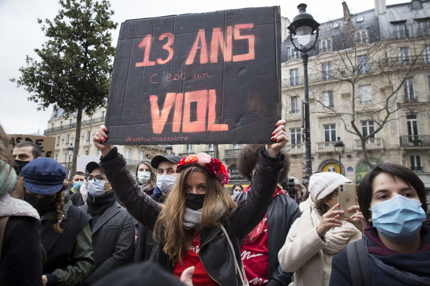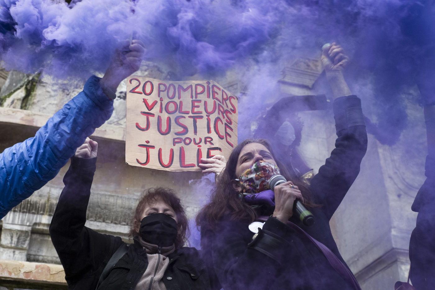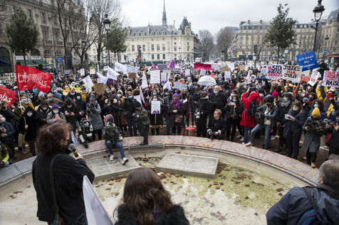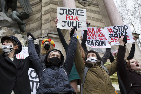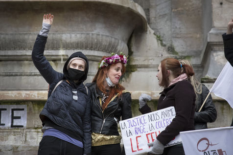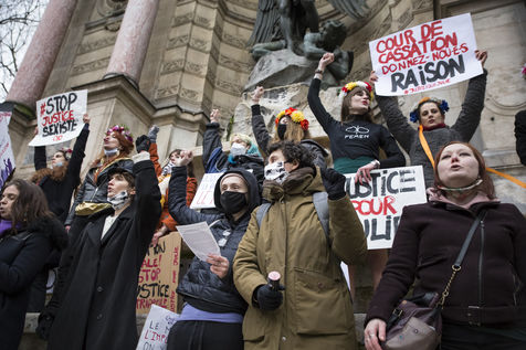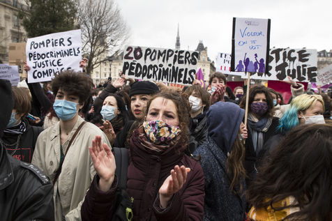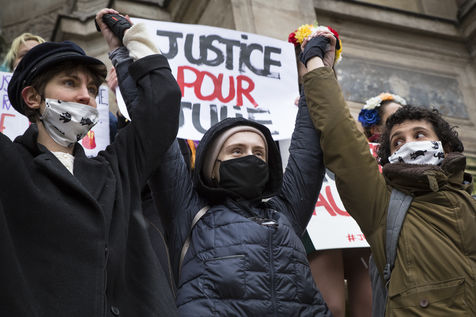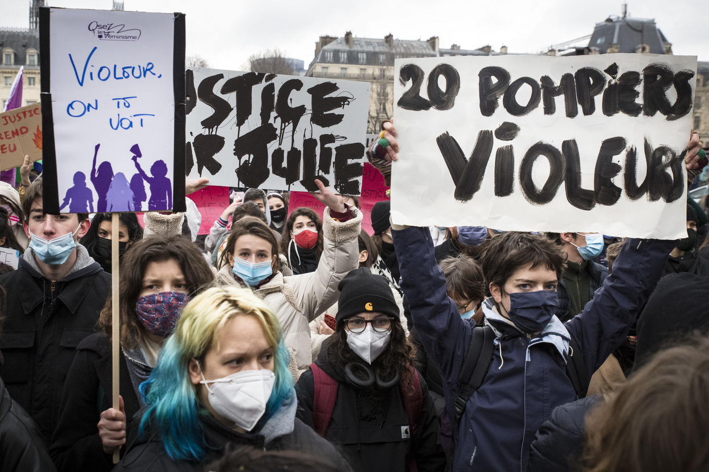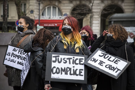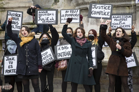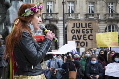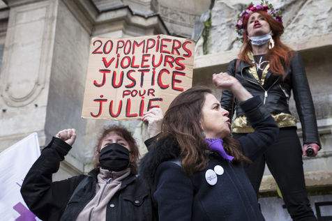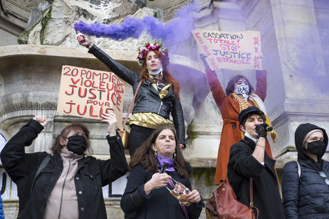 Sunday February 7, 2021, place Saint-Michel, Paris, France. Support rally for Julie (pseudonym) before her case is re-examined by the Court of Cassation on February 10. Julie accuses 20 members of the Paris fire brigade of repeated rapes between the ages of 13 and 15. After 10 years of legal battle, only three of them have been prosecuted and the recent dequalification of rape acts as sexual assault is causing anger. Julie and her mother, Corinne Leriche, are fighting for all the attackers to be judged, and that the facts be reclassified as rapes of a minor in a meeting.