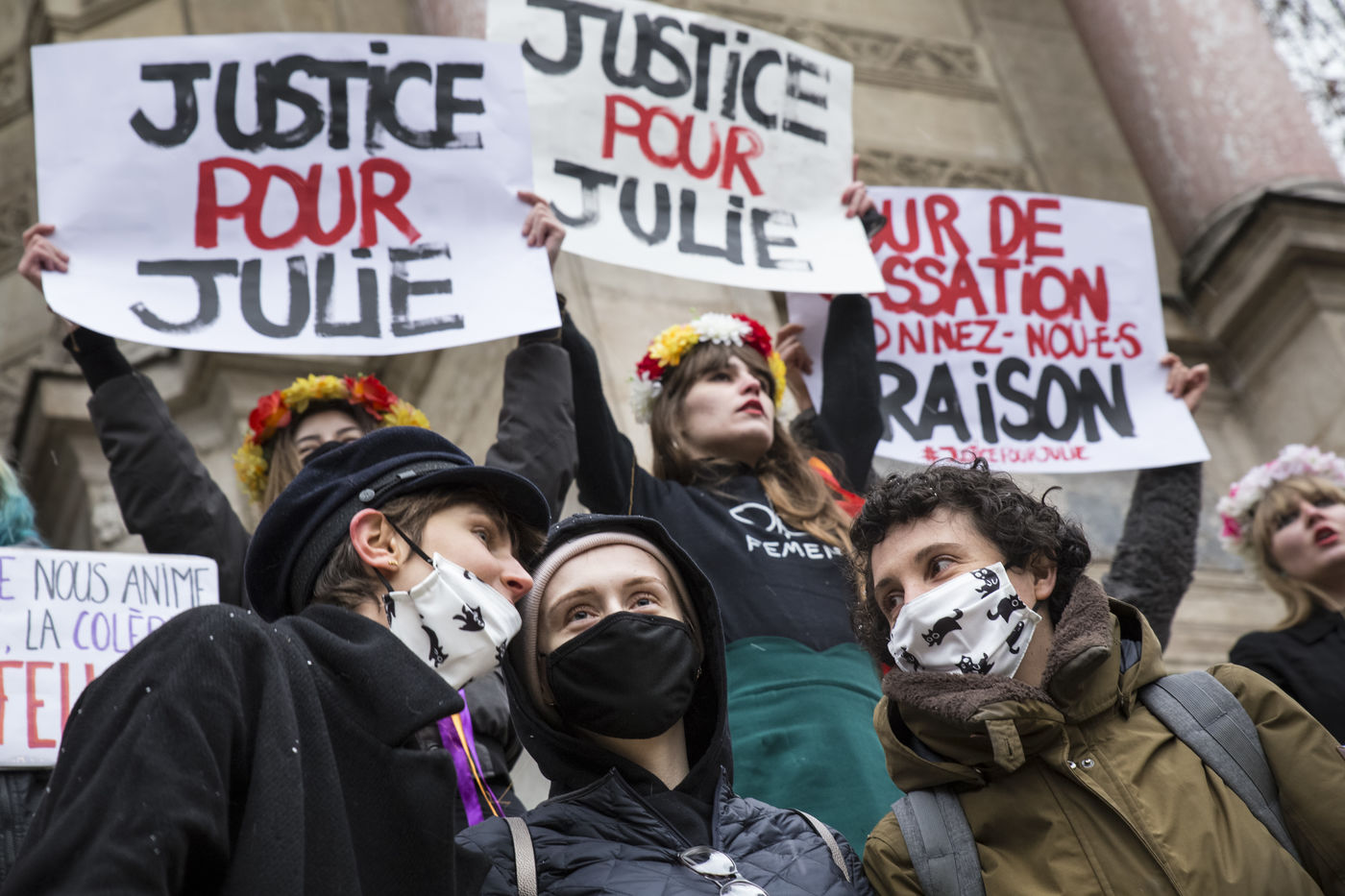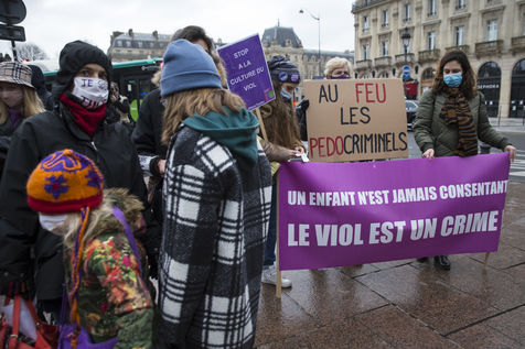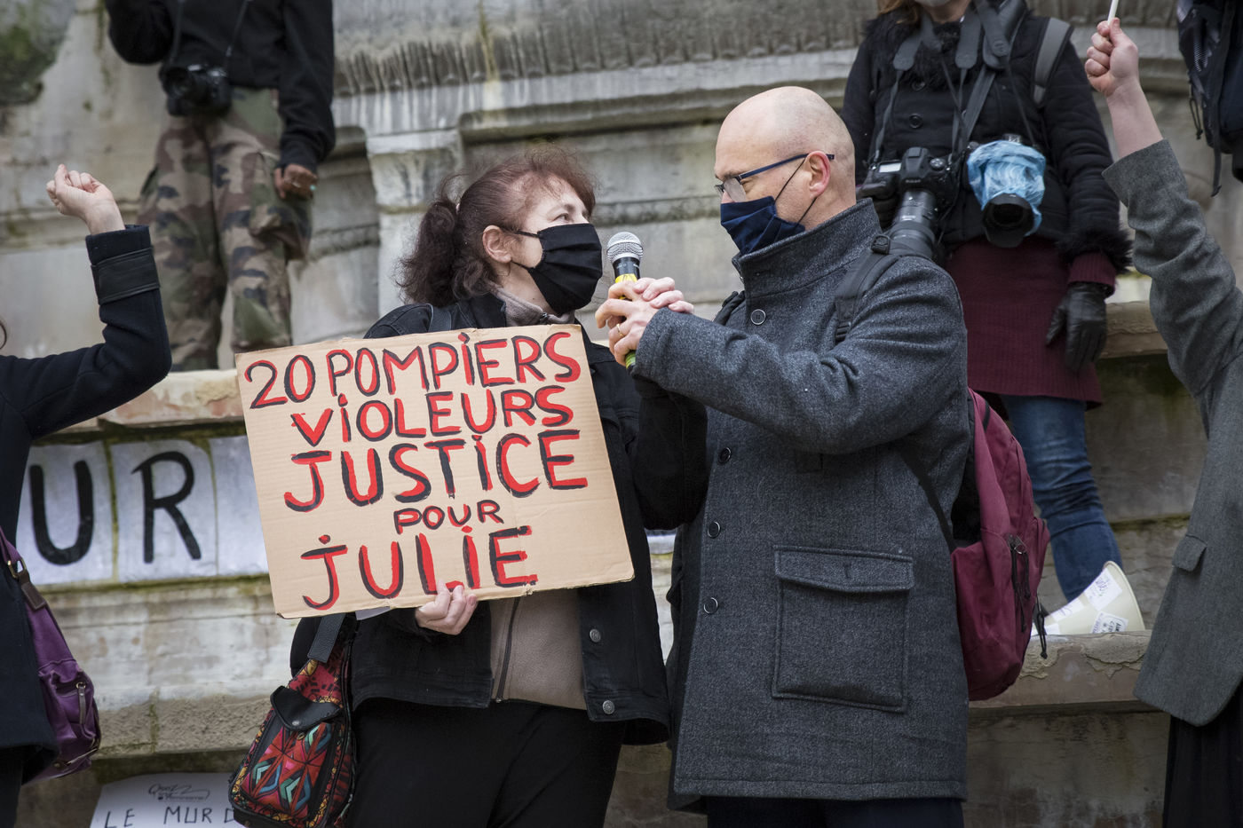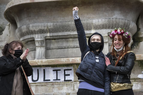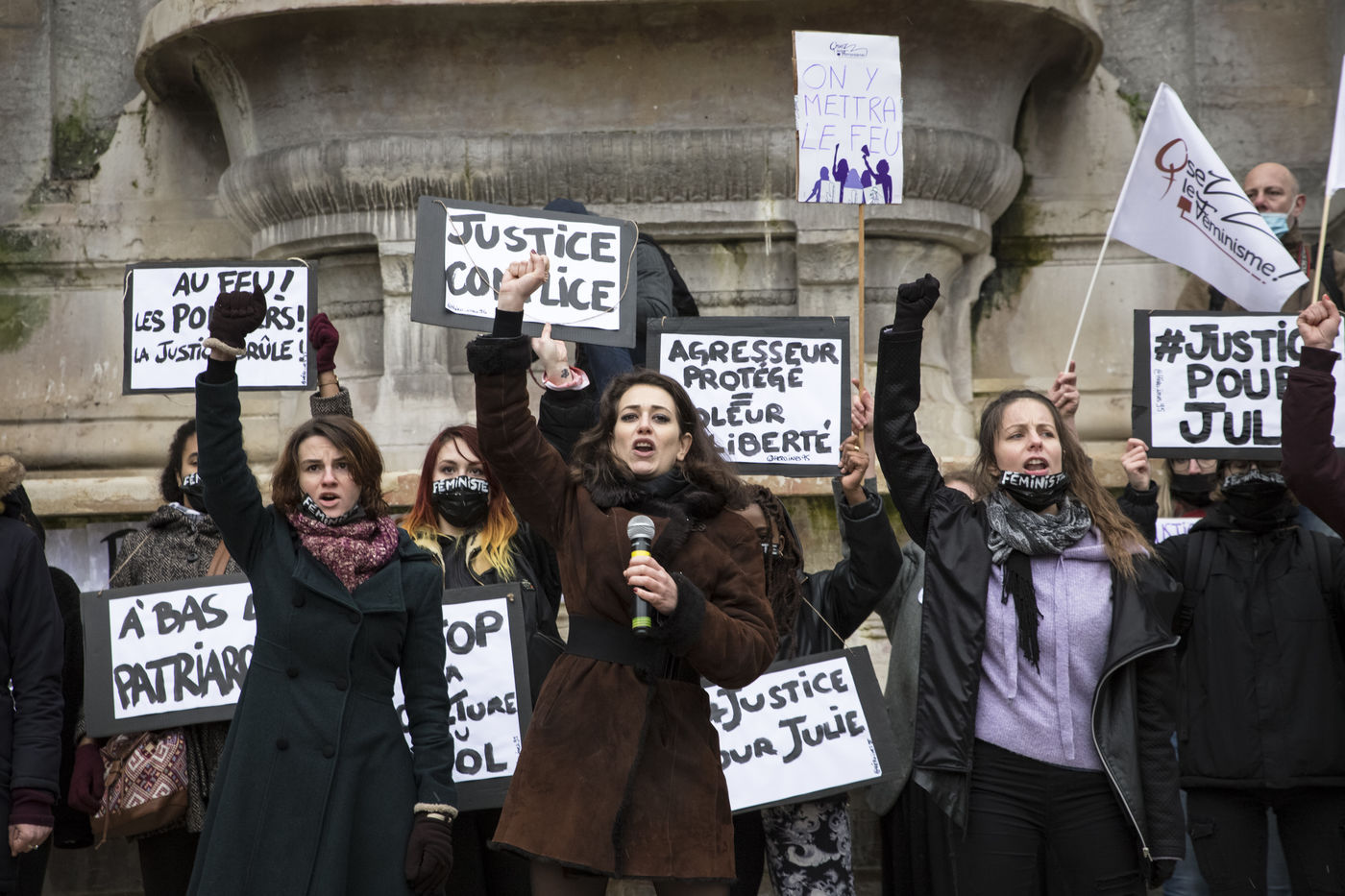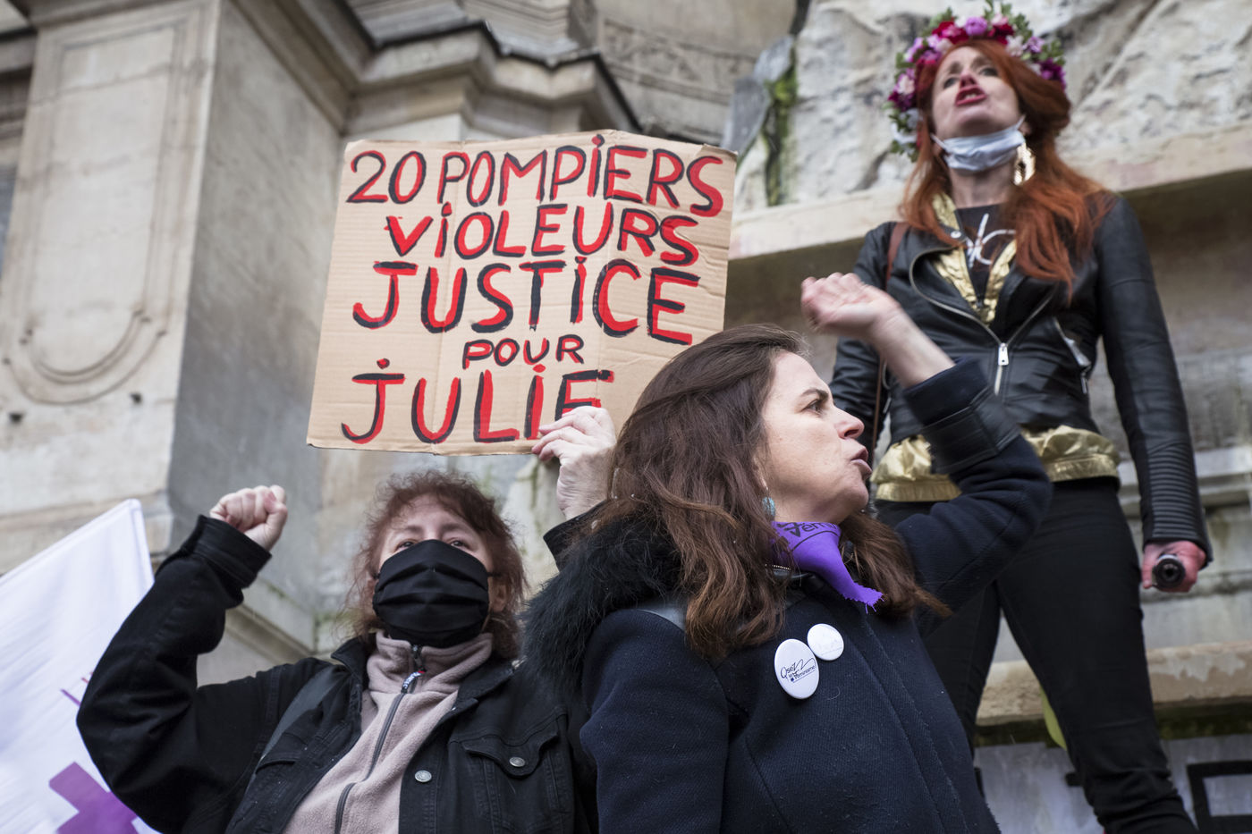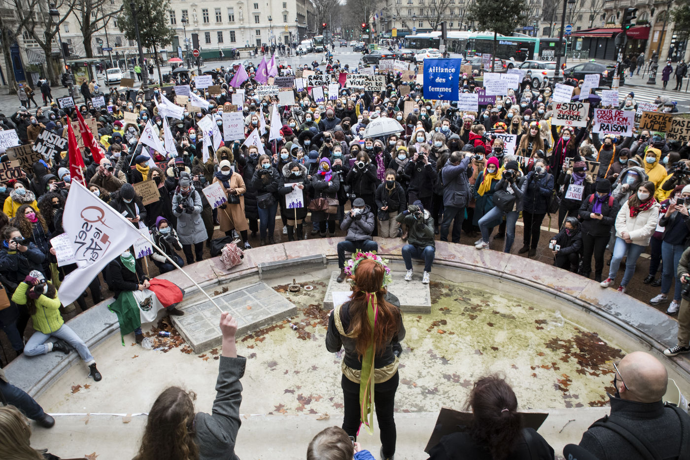 Sunday February 7, 2021, place Saint-Michel, Paris, France. Support rally for Julie (pseudonym) before her case is re-examined by the Court of Cassation on February 10. Julie accuses 20 members of the Paris fire brigade of repeated rapes between the ages of 13 and 15. After 10 years of legal battle, only three of them have been prosecuted and the recent dequalification of rape acts as sexual assault is causing anger. Julie and her mother, Corinne Leriche, are fighting for all the attackers to be judged, and that the facts be reclassified as rapes of a minor in a meeting.