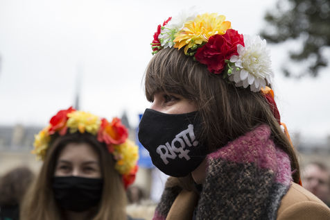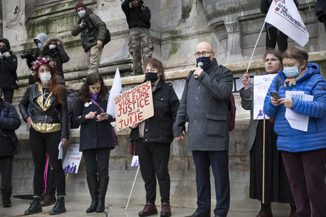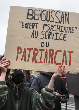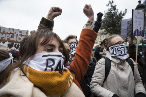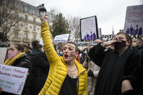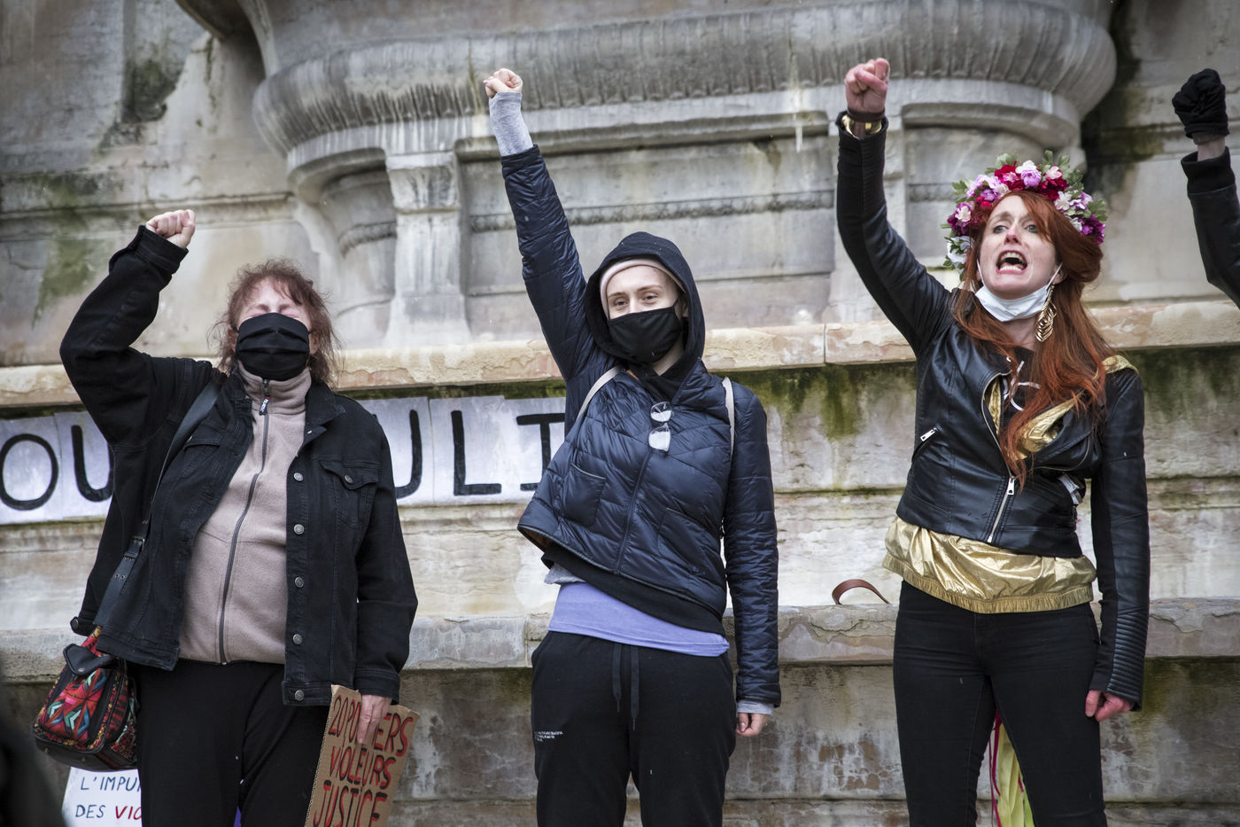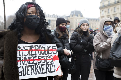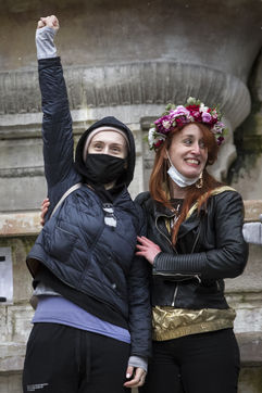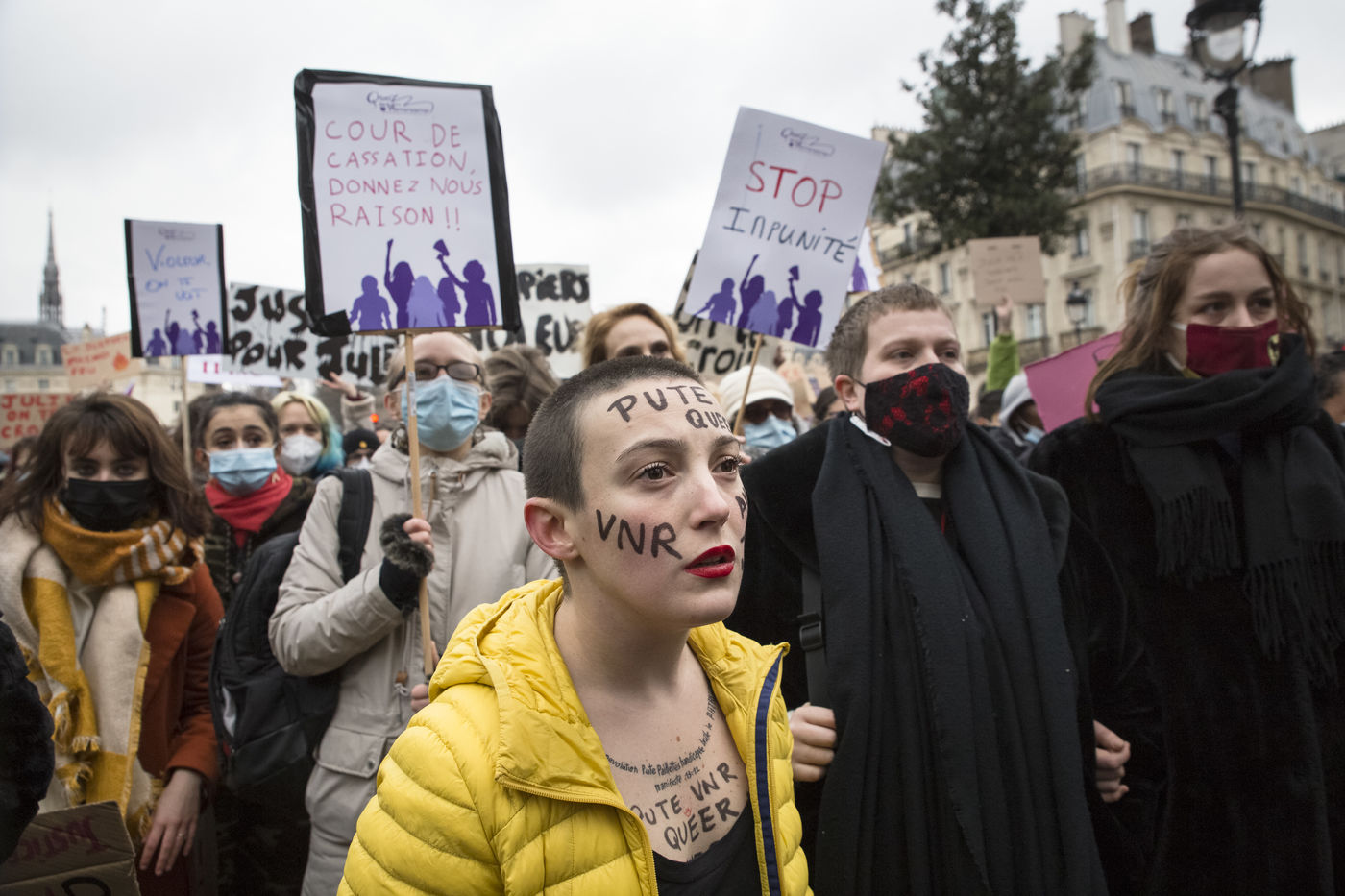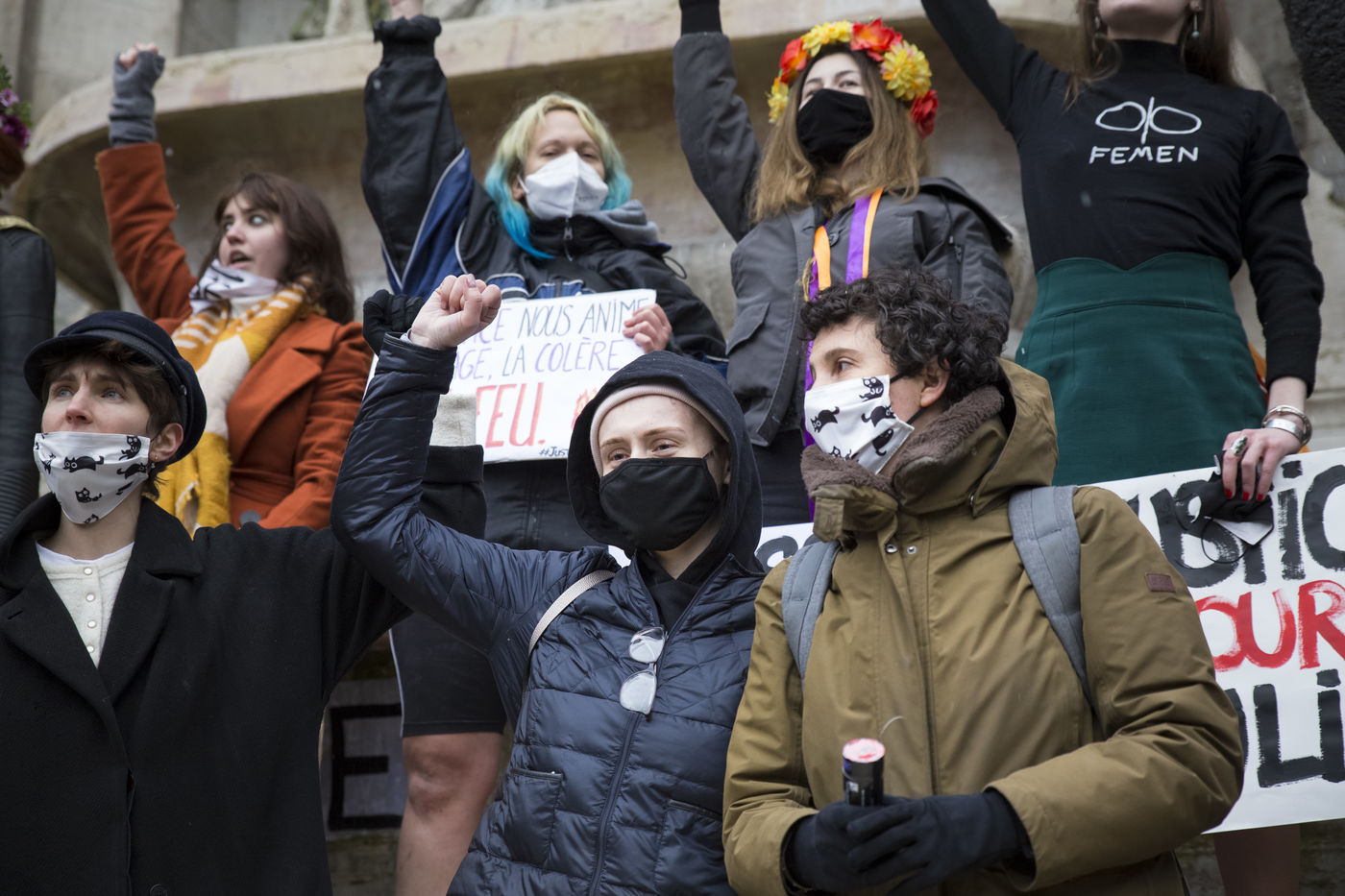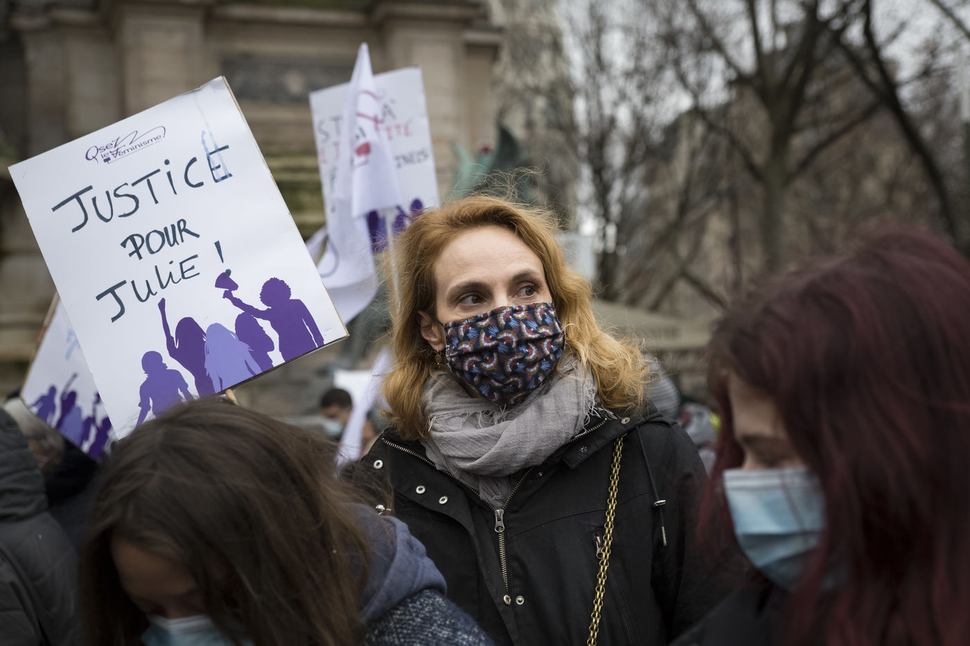 Sunday February 7, 2021, place Saint-Michel, Paris, France. Support rally for Julie (pseudonym) before her case is re-examined by the Court of Cassation on February 10. Julie accuses 20 members of the Paris fire brigade of repeated rapes between the ages of 13 and 15. After 10 years of legal battle, only three of them have been prosecuted and the recent dequalification of rape acts as sexual assault is causing anger. Julie and her mother, Corinne Leriche, are fighting for all the attackers to be judged, and that the facts be reclassified as rapes of a minor in a meeting.