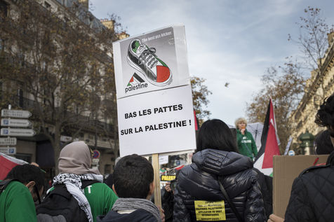 Manifestation à l'occasion de la journée internationale de solidarité avec la Palestine. Le cortège parti de la place du Chatelet a rejoint en fin de manifestation les dizaines de personnes rassemblées place de la Republique pour cette journée.