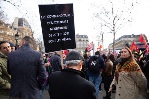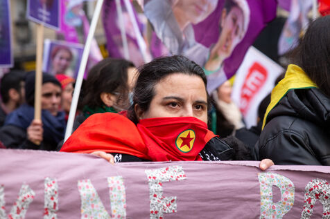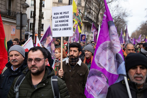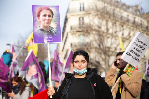 FRANCE, Paris, January 7, 2023. A large march in honor of the three Kurdish activists Sakine Cansiz (Sara), co-founder of the PKK, Fidan Dogan (Rojbin), representative in France of the Kurdistan National Congress (KNK), and Leyla Saylemez (Ronahi), a member of the Kurdish youth movement, who were murdered in Paris, in the 10th arrondissement, on the night of January 9 to 10, 2013.