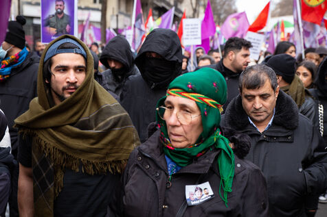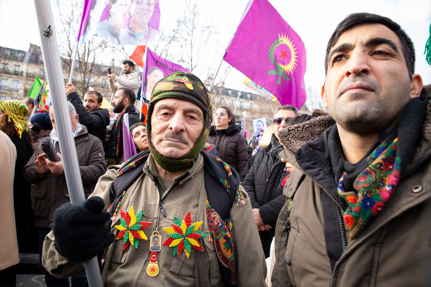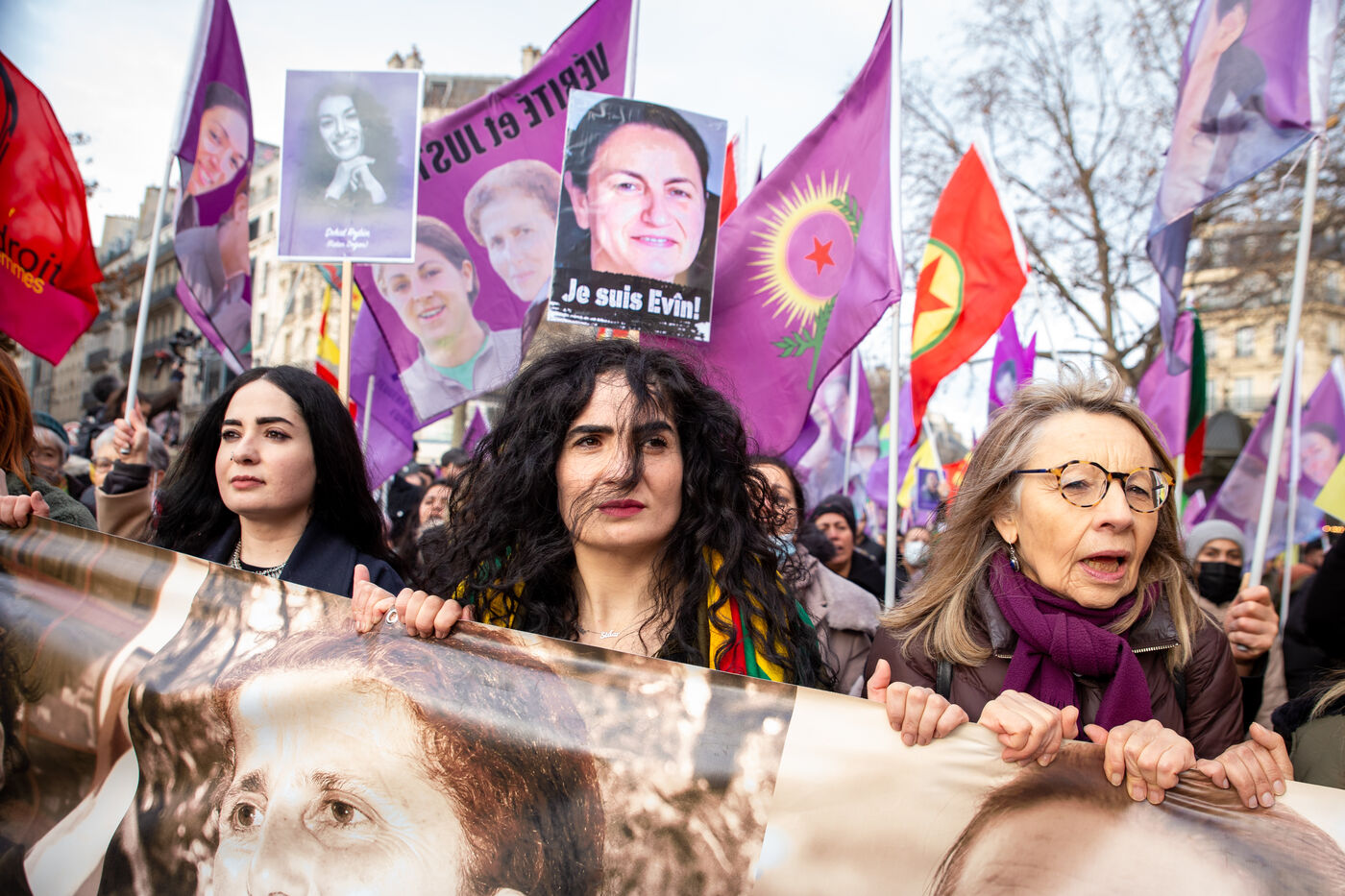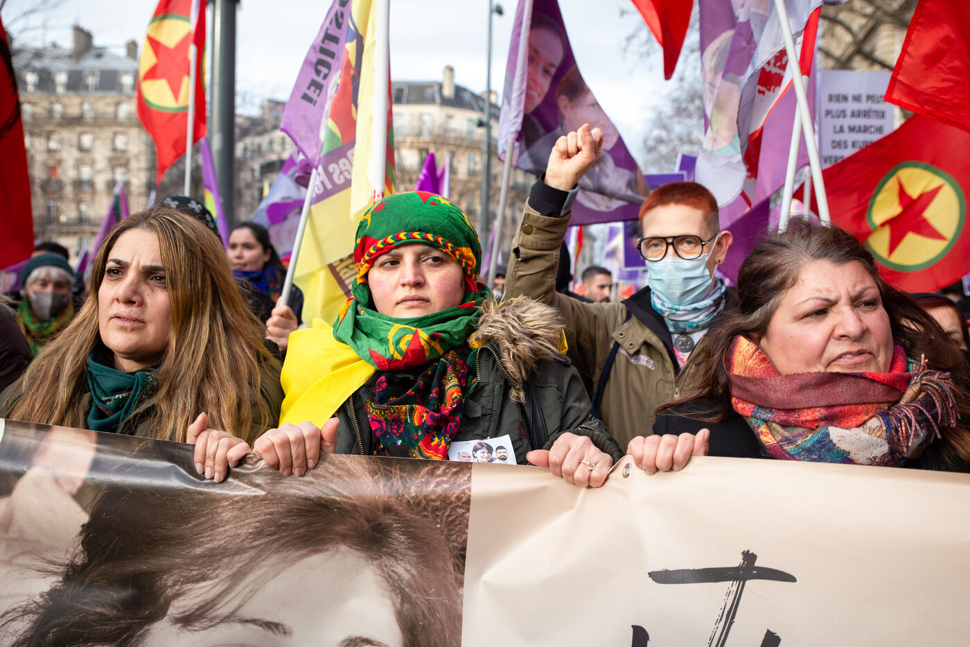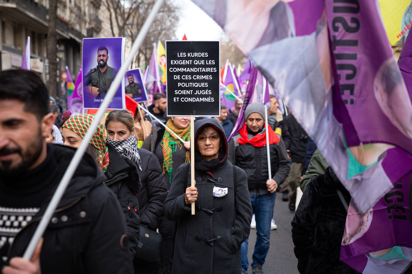 FRANCE, Paris, le 07 janvier 2023. Grande marche en hommage aux trois militantes kurdes Sakine Cansiz (Sara), co-fondatrice du PKK, Fidan Dogan (Rojbin), représentante en France du Congres national du Kurdistan (KNK), et Leyla Saylemez (Ronahi), membre du mouvement de jeunesse kurde, assassinées a Paris, dans le 10e arrondissement, dans la nuit du 9 au 10 janvier 2013.