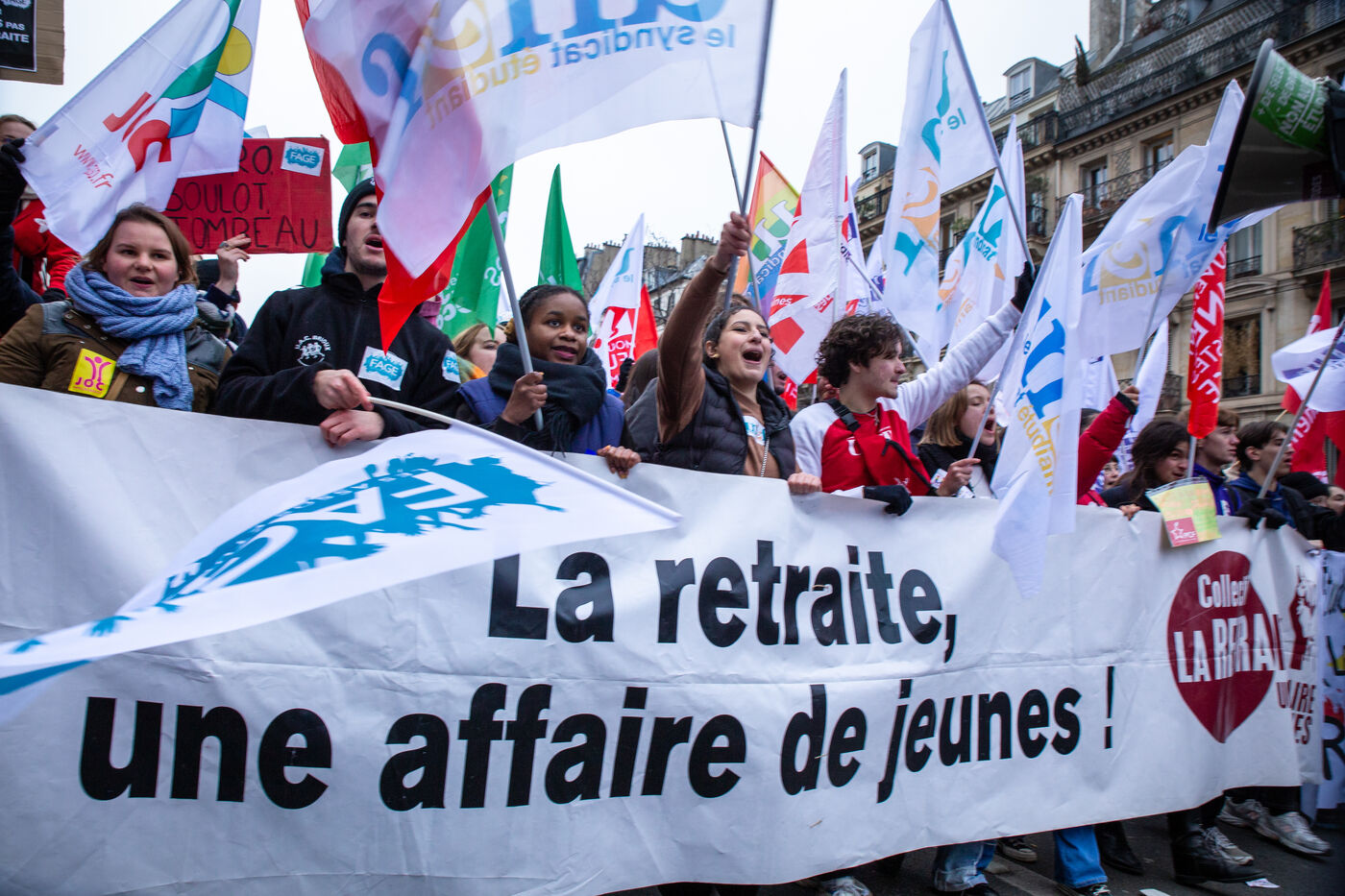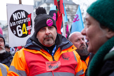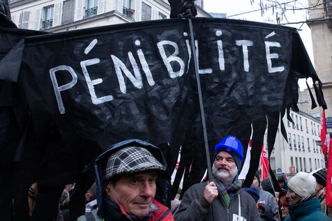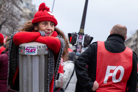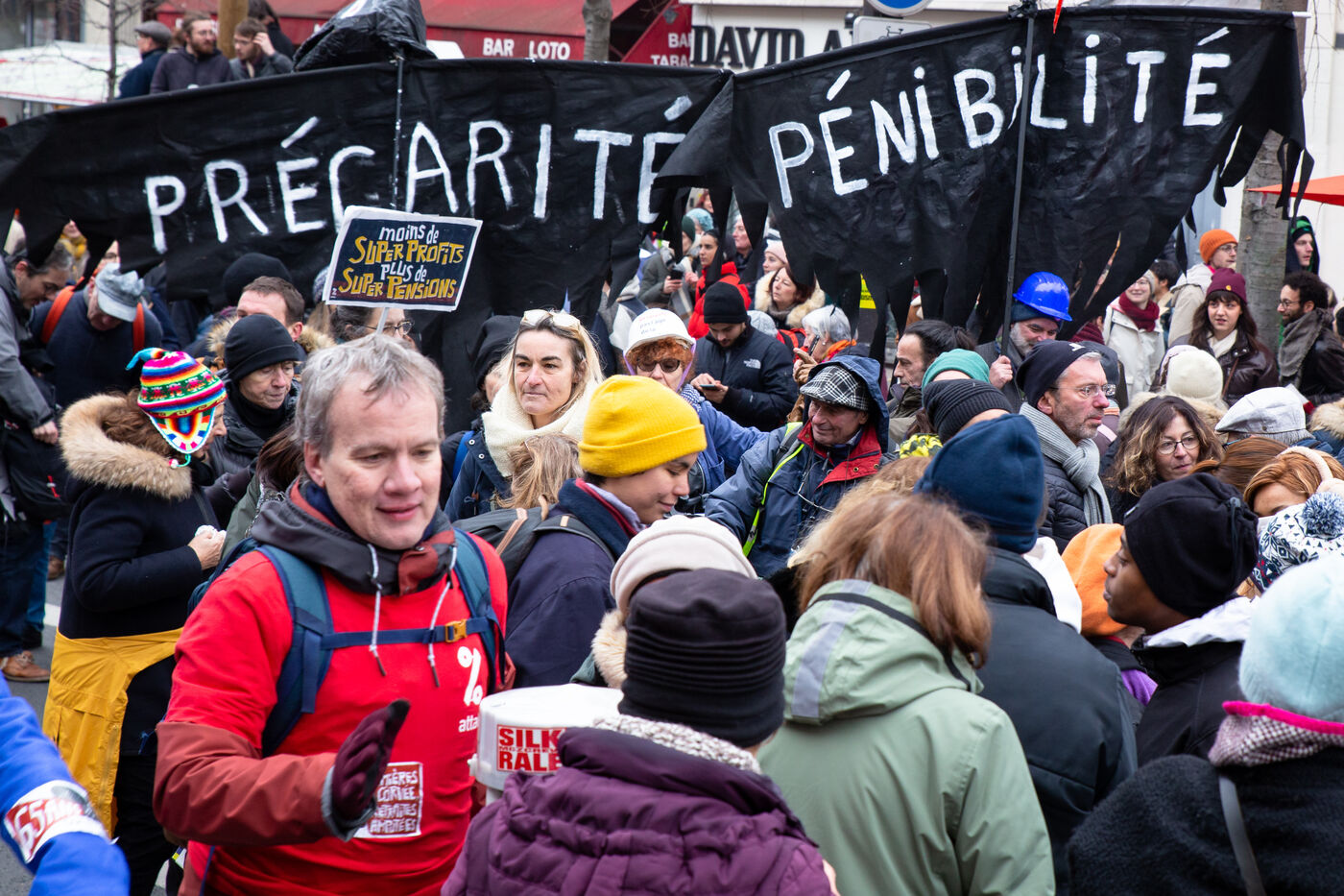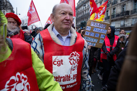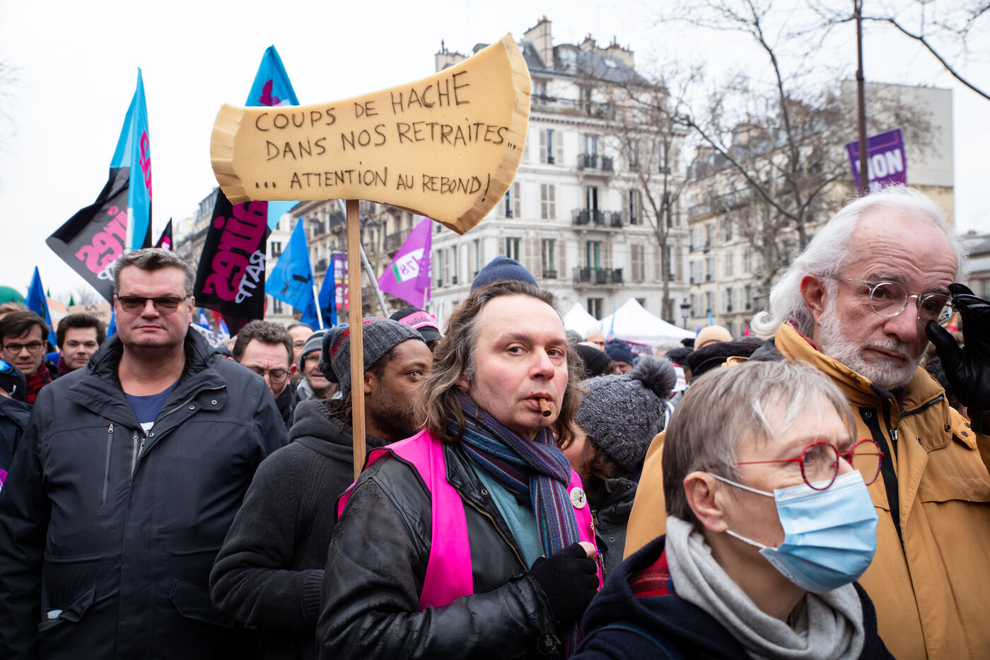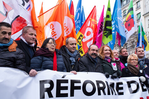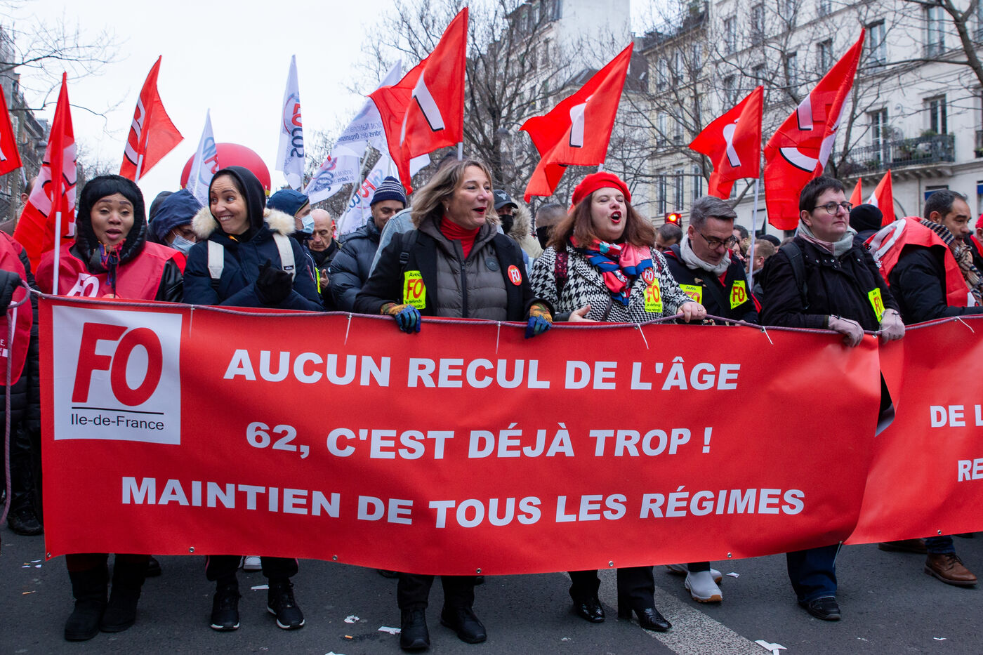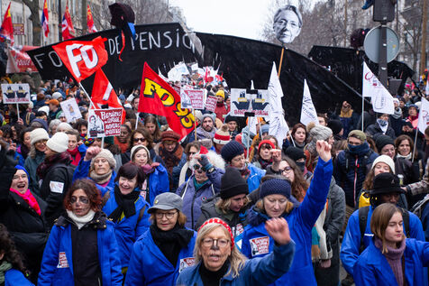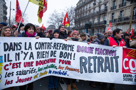 France, Paris, January 19, 2023. Parisian demonstration against the pension reform. First day of mobilization against the reform carried by Elizabeth Borne and her government. The demonstrators protest against the postponement of the legal retirement age to 64 years and the acceleration of the increase of the contribution period.