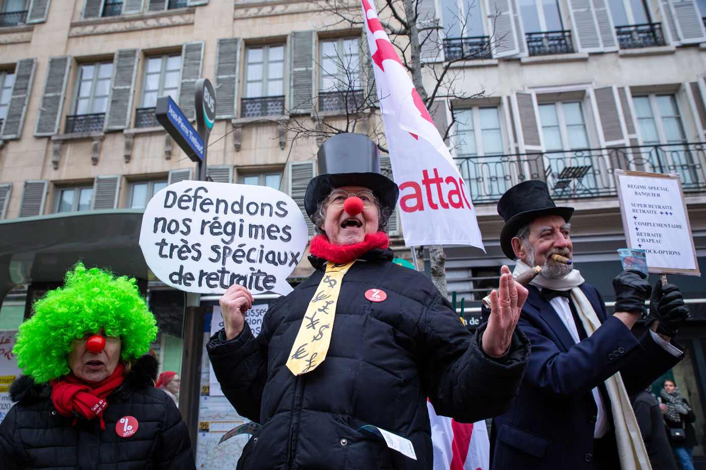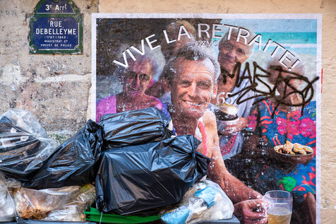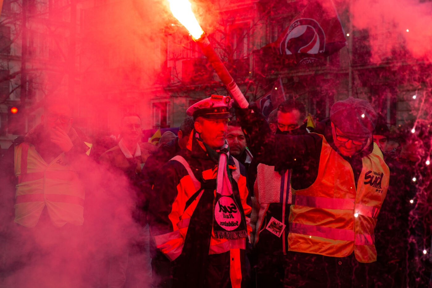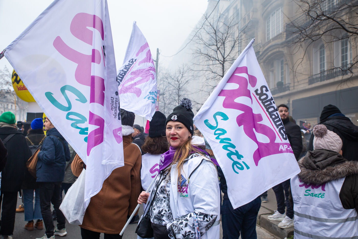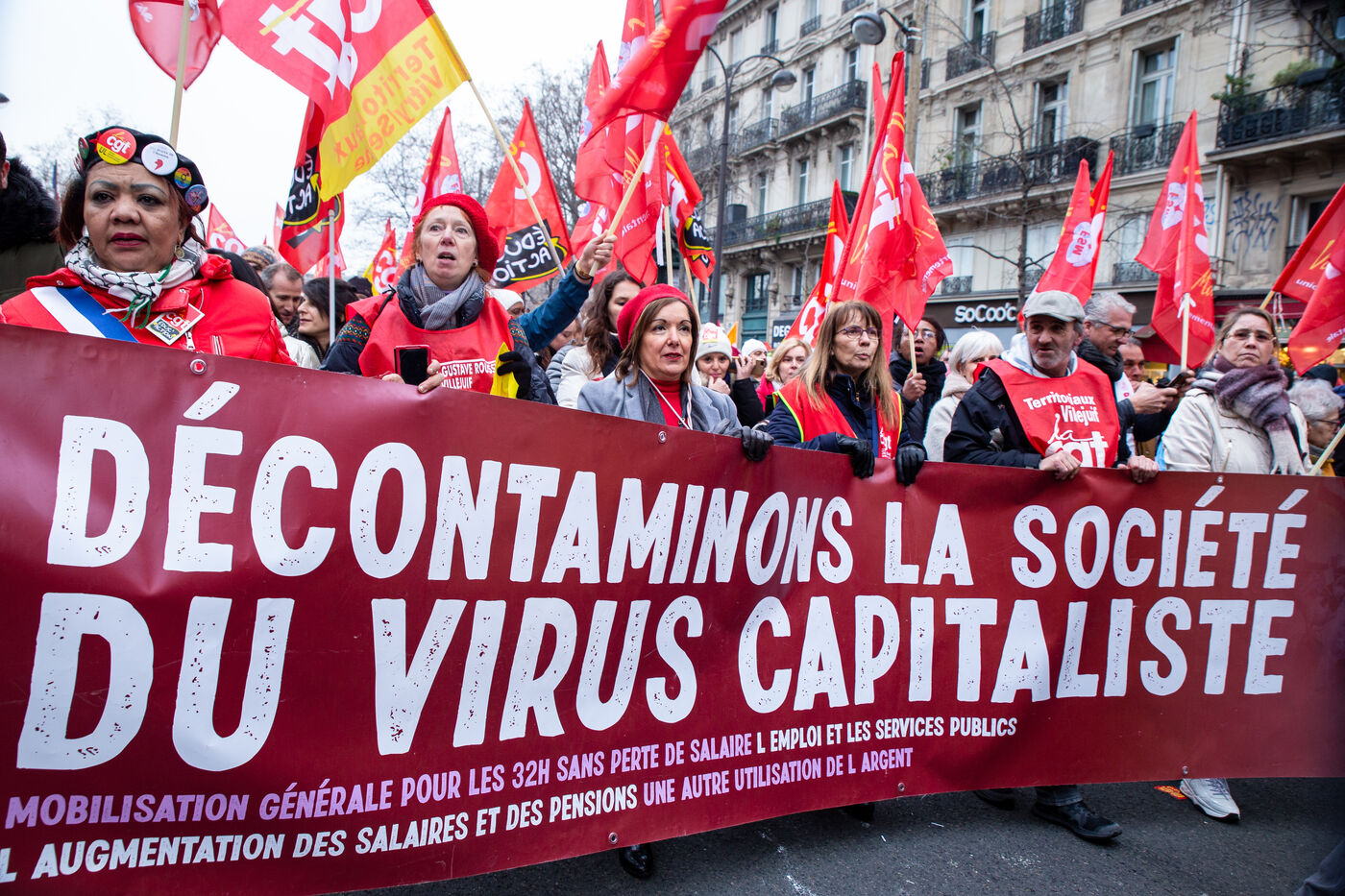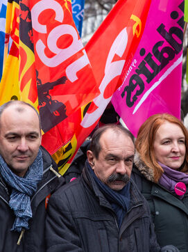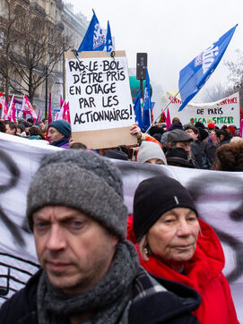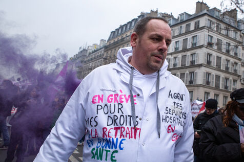 France, Paris, January 19, 2023. Parisian demonstration against the pension reform. First day of mobilization against the reform carried by Elizabeth Borne and her government. The demonstrators protest against the postponement of the legal retirement age to 64 years and the acceleration of the increase of the contribution period.