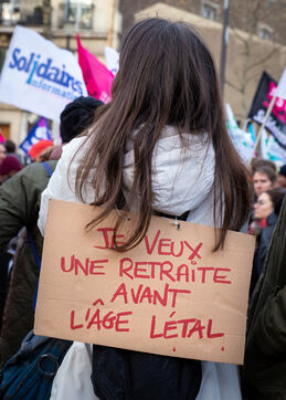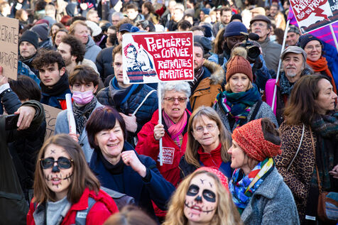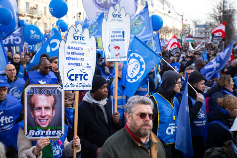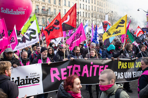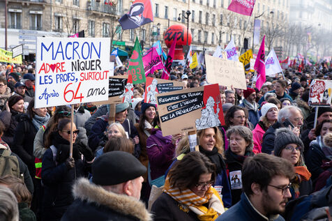 France, Paris, January 31, 2023. Parisian demonstration against the pension reform. Second day of inter-union mobilization against the reform carried by Elizabeth Borne and her government. The demonstrators protest against the postponement of the legal retirement age to 64 years and the acceleration of the increase in the contribution period.