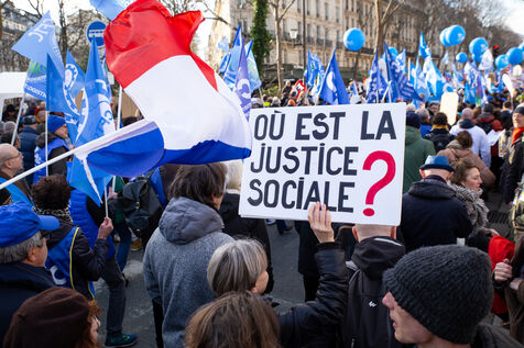 France, Paris, le 31 janvier 2023. Manifestation parisienne contre la reforme des retraites. Deuxieme journee de mobilisation intersyndicale contre la reforme portee par Elizabeth Borne et son gouvernement. Les manifestants protestent contre le report de l age legal de la retraite a 64 ans et l acceleration de l augmentation de la duree de cotisation.