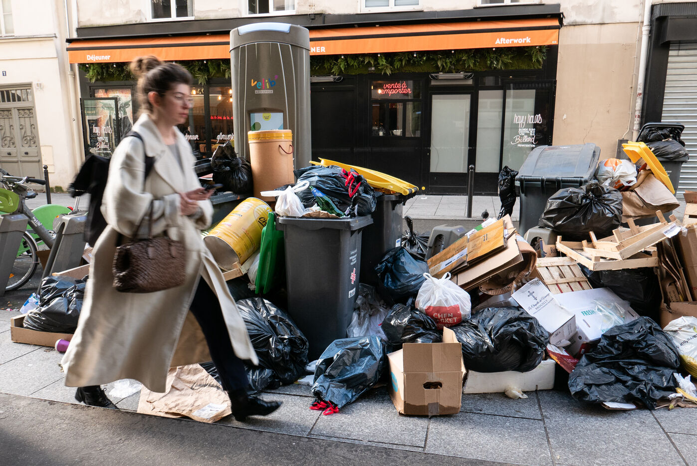 France, Paris, March 14, 2023. Illustration. Strike of the garbage collectors. Overflowing garbage cans and garbage bags in a Paris street. The garbage collectors of the city of Paris are on strike since March 7 to protest against the reform brought by Elizabeth Borne and her government.