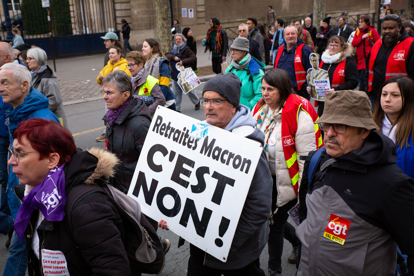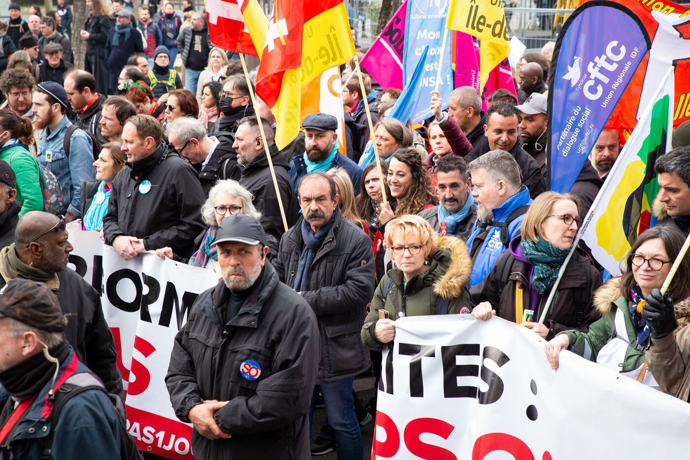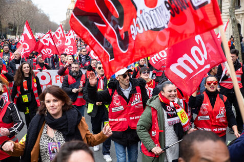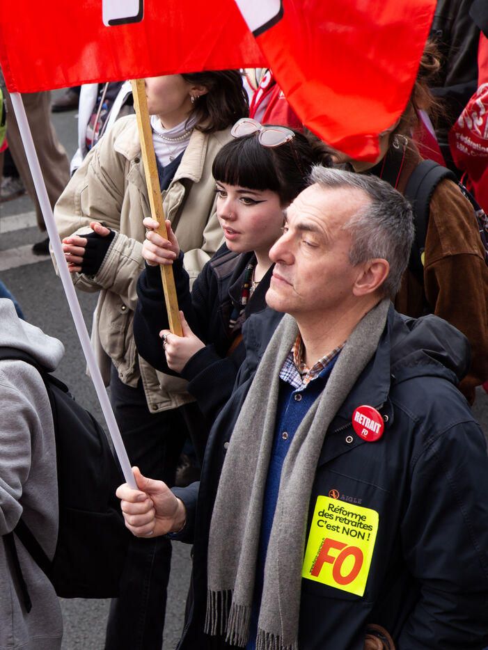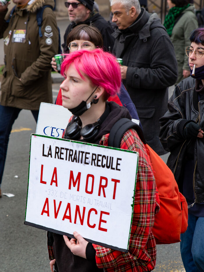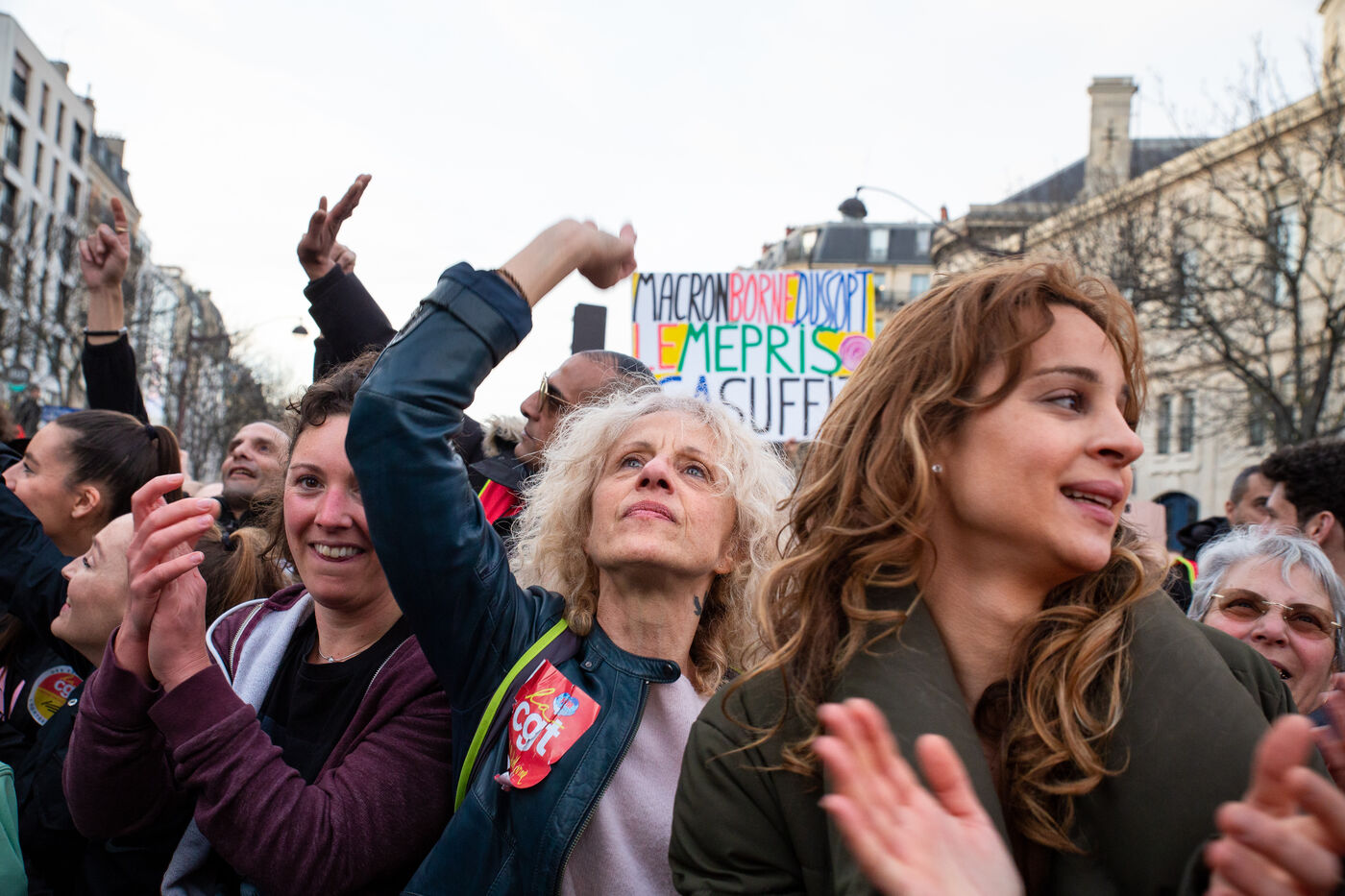 France, Paris, March 15, 2023. Parisian demonstration against the pension reform. Eighth day of mobilization against the reform of the pension system by Elizabeth Borne and her government. The demonstrators are protesting against the postponement of the legal retirement age to 64 years and the acceleration of the increase in the contribution period.