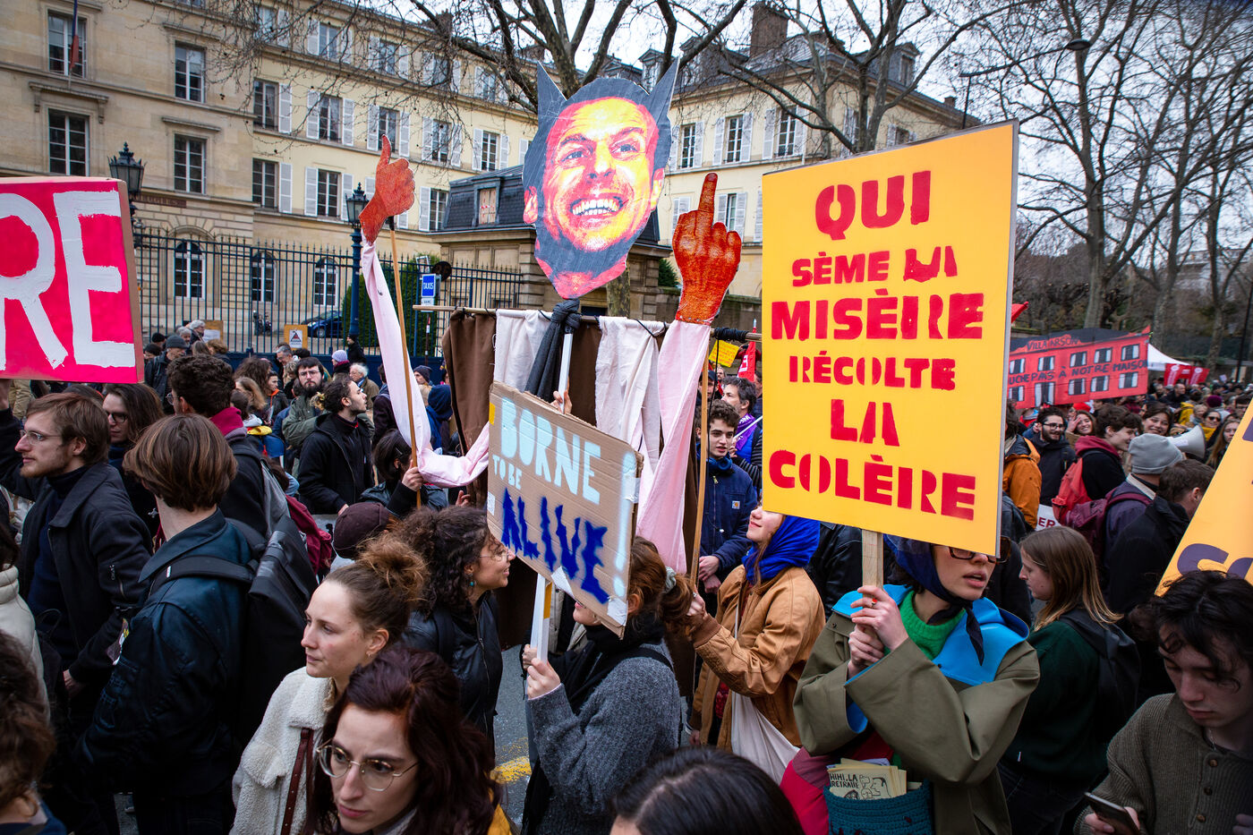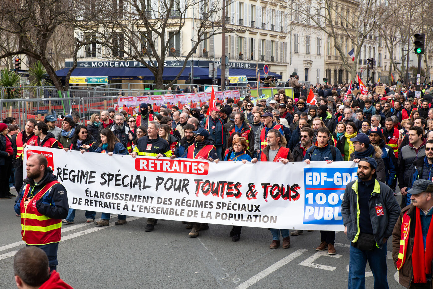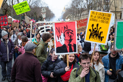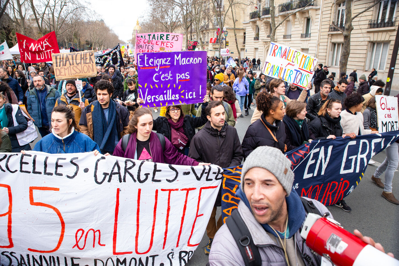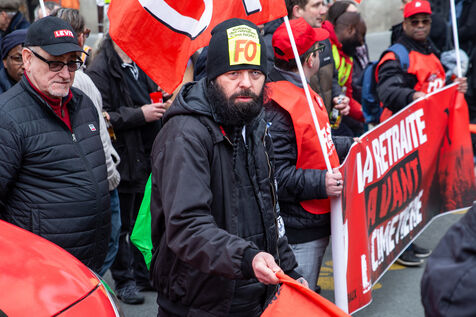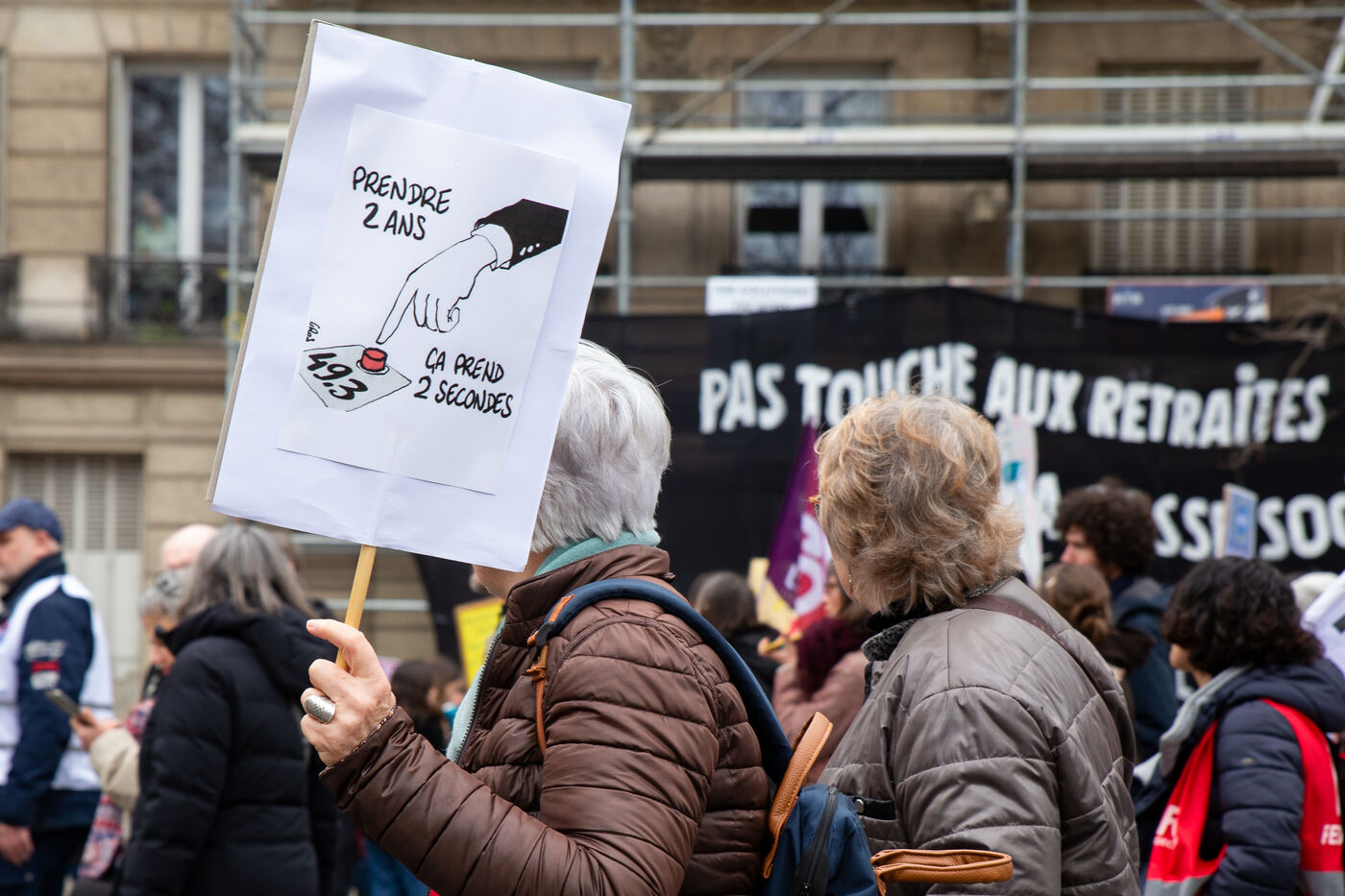 France, Paris, March 15, 2023. Parisian demonstration against the pension reform. Eighth day of mobilization against the reform of the pension system by Elizabeth Borne and her government. The demonstrators are protesting against the postponement of the legal retirement age to 64 years and the acceleration of the increase in the contribution period.
