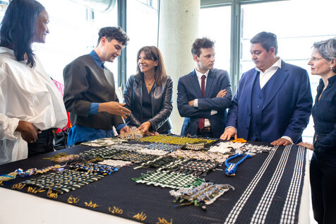 France, Paris, May 23, 2023 Inauguration of the Manufacture Berlier, in the 13th arrondissement of Paris. The RIVP's Berlier building houses a social, solidarity-based, circular textile factory. In the presence of the mayor of Paris, deputy mayors of the city of Paris, the mayor of the 13th arrondissement, and the president of the RIVP. Jerome COUMET (Mayor of 13?), David Belliard (deputy mayor), Anne Hidalgo (mayor of Paris) and Sandrine Rousseau (deputee ecologiste Nupes) visit the stands.