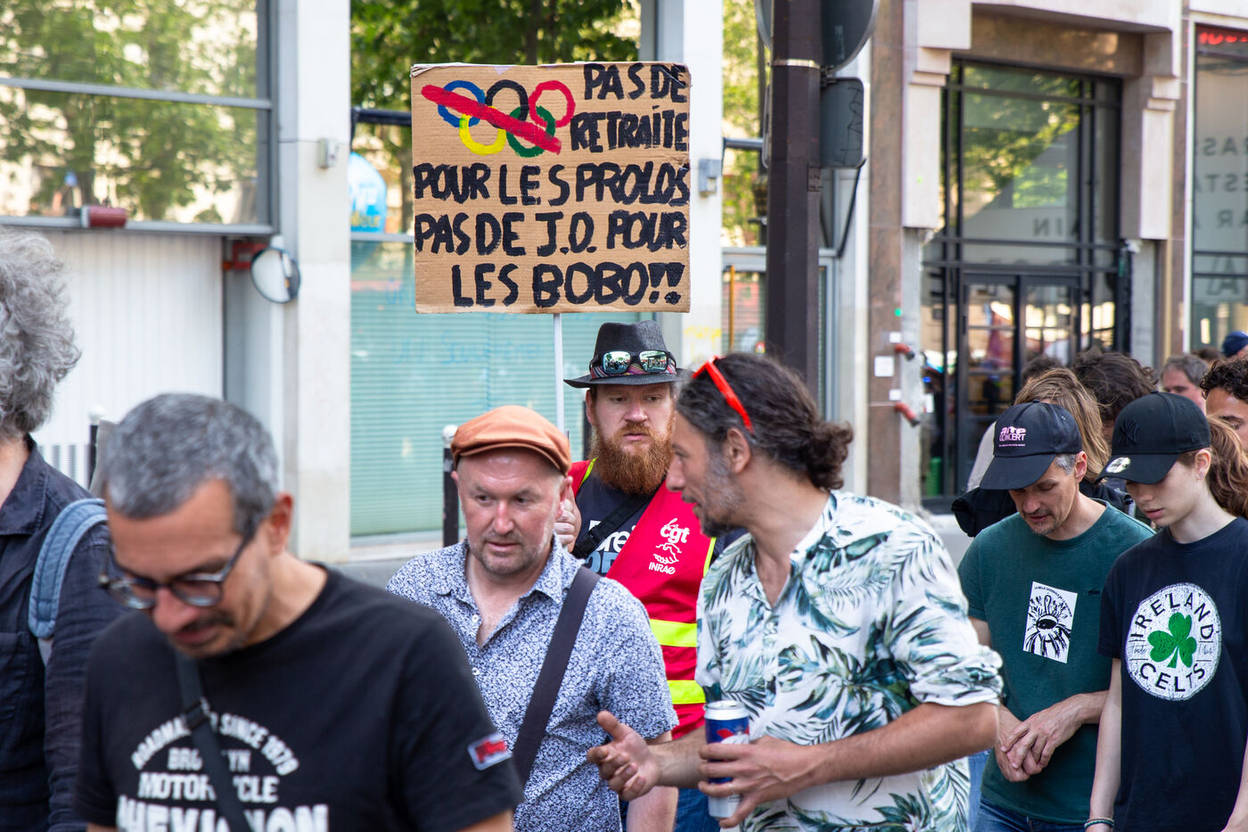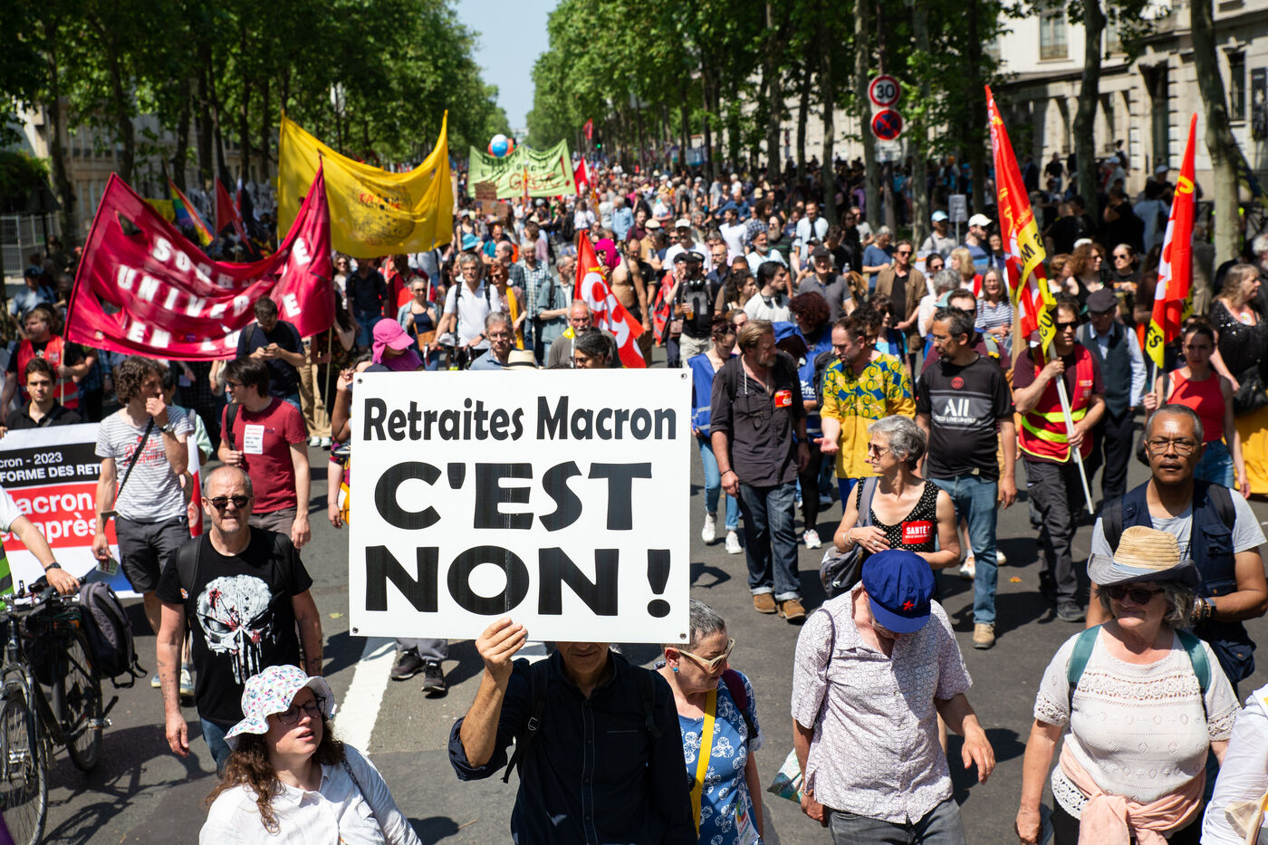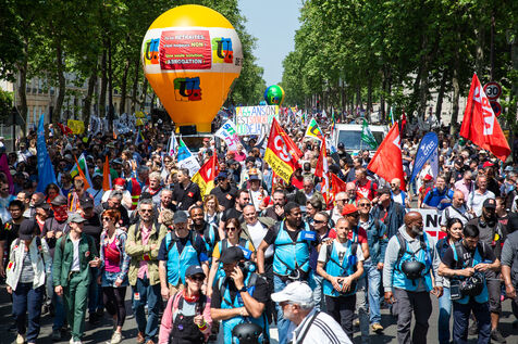 France, Paris, le 6 juin 2023. Manifestation parisienne contre la reforme des retraites. Quatorzieme journee de mobilisation intersyndicale contre la reforme portee par Elizabeth Borne et son gouvernement. Les manifestants protestent contre le report de l age legal de la retraite a 64 ans et l acceleration de l augmentation de la duree de cotisation.