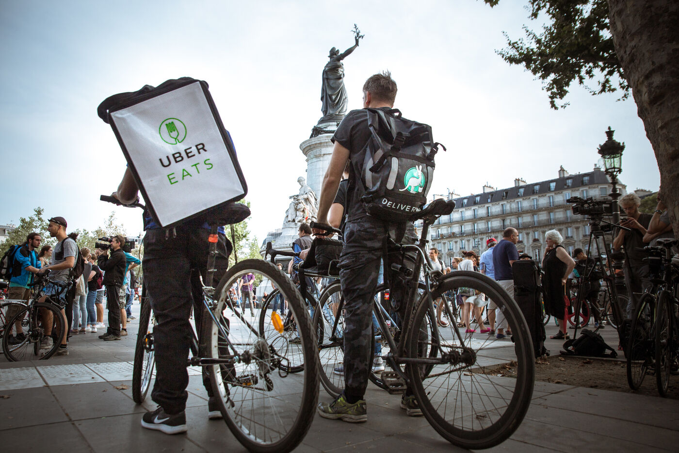 Sunday, August 27, 2017, Paris, France. Thirty to forty parisian bicycle drivers have gathered in the Place de la République. Deliveroo couriers joined by some of the other platforms (Foodora, Stuart and UberEATS) contest the new contracts implemented by Deliveroo and try to organize the fight against the precariousness of their condition.