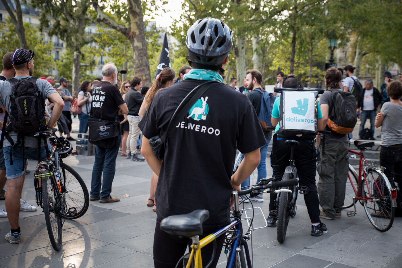 Dimanche 27 août 2017, Paris, France. Trente à quarante livreurs à vélos parisiens se sont rassemblés place de la République. Les coursiers Deliveroo rejoints par certains d'autres plateformes (Foodora, Stuart et UberEATS) contestent les nouveaux contrats mis en application par Deliveroo et tente d'organiser la lutte contre la précarité de leur condition.