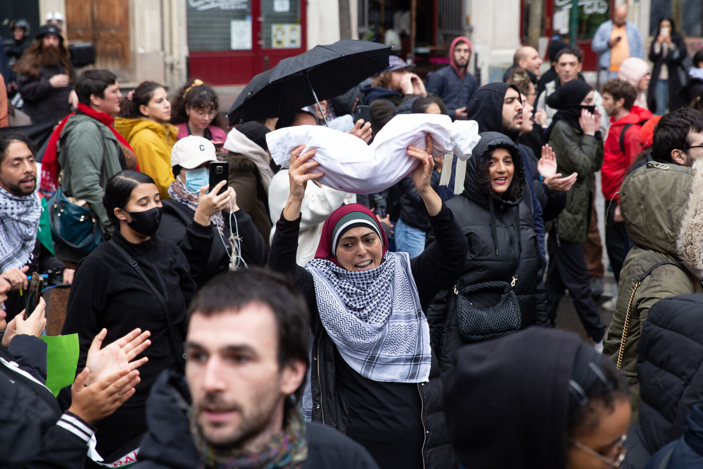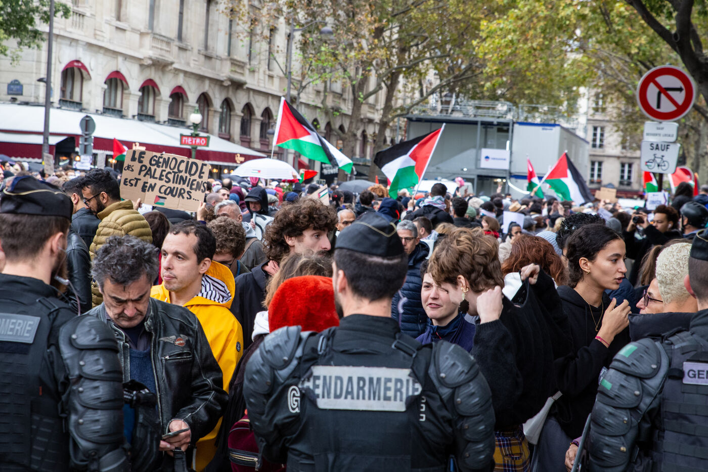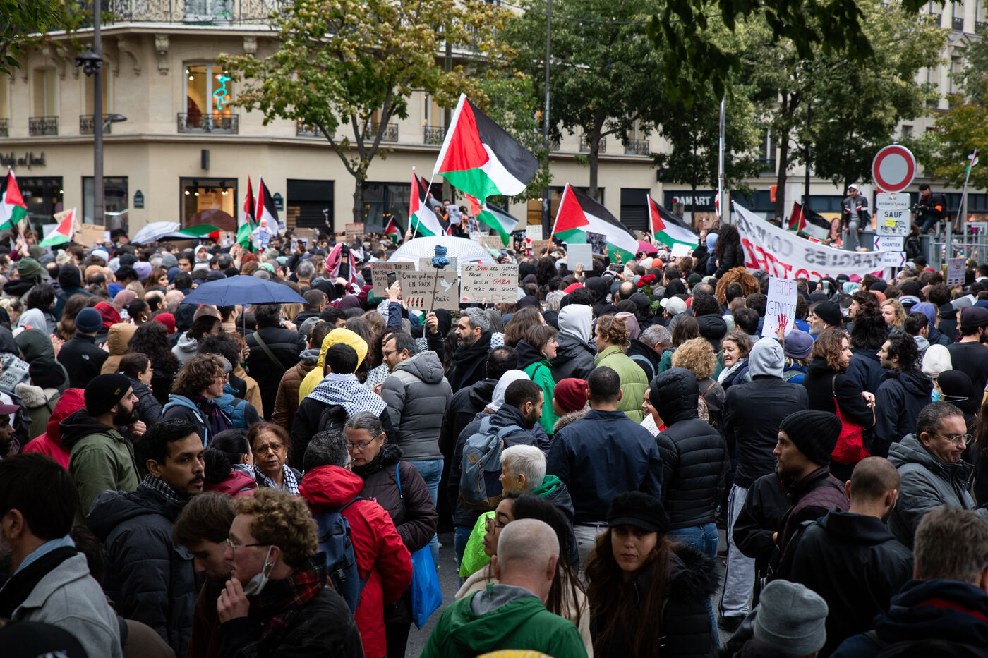 France, Paris, le 28 octobre 2023. Rassemblement en soutien au peuple palestinien, interdit par la Prefecture de Paris dans un contexte d alerte urgence attentat en France. Les manifestants venus exiger la fin de l?intervention militaire israelienne et bombardements sur Gaza, sont rapidement pris dans une nasse.