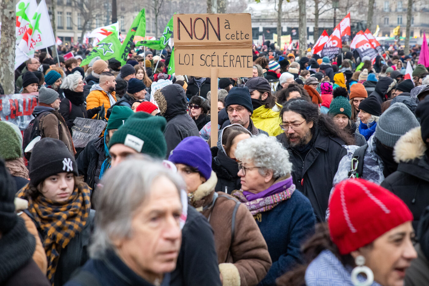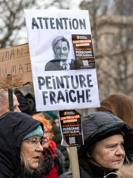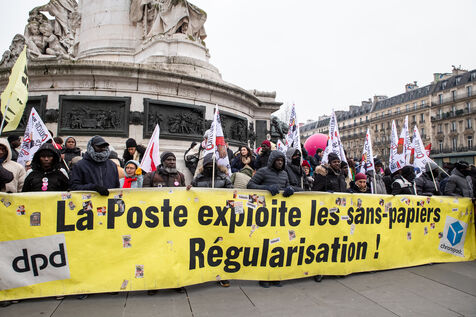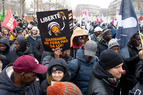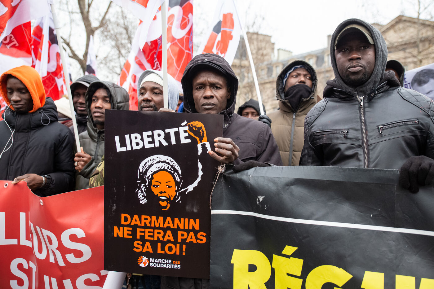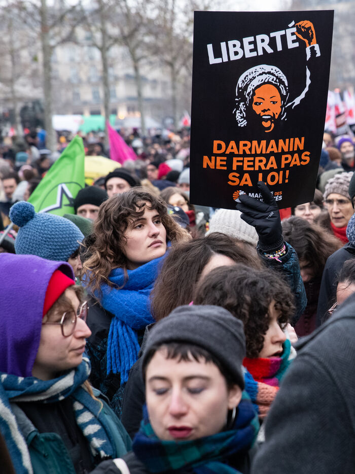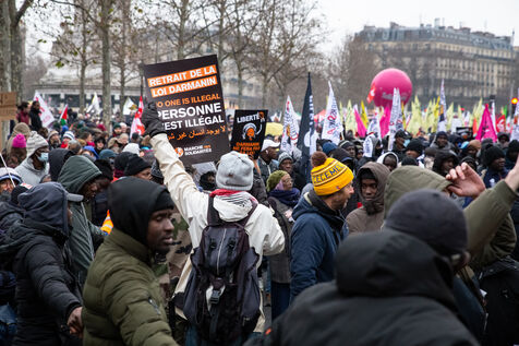 France, Paris, 14 January 2024. Demonstration in Paris against the Asylum and Immigration Bill, known as the Darmanin Bill, which provides for migration quotas, tougher rules on family reunification and access to certain benefits, as well as measures on integration, residence and asylum applications. Adopted at the end of December 2023, the bill is currently being examined by the Constitutional Council.