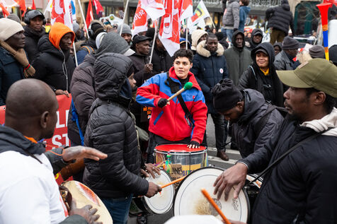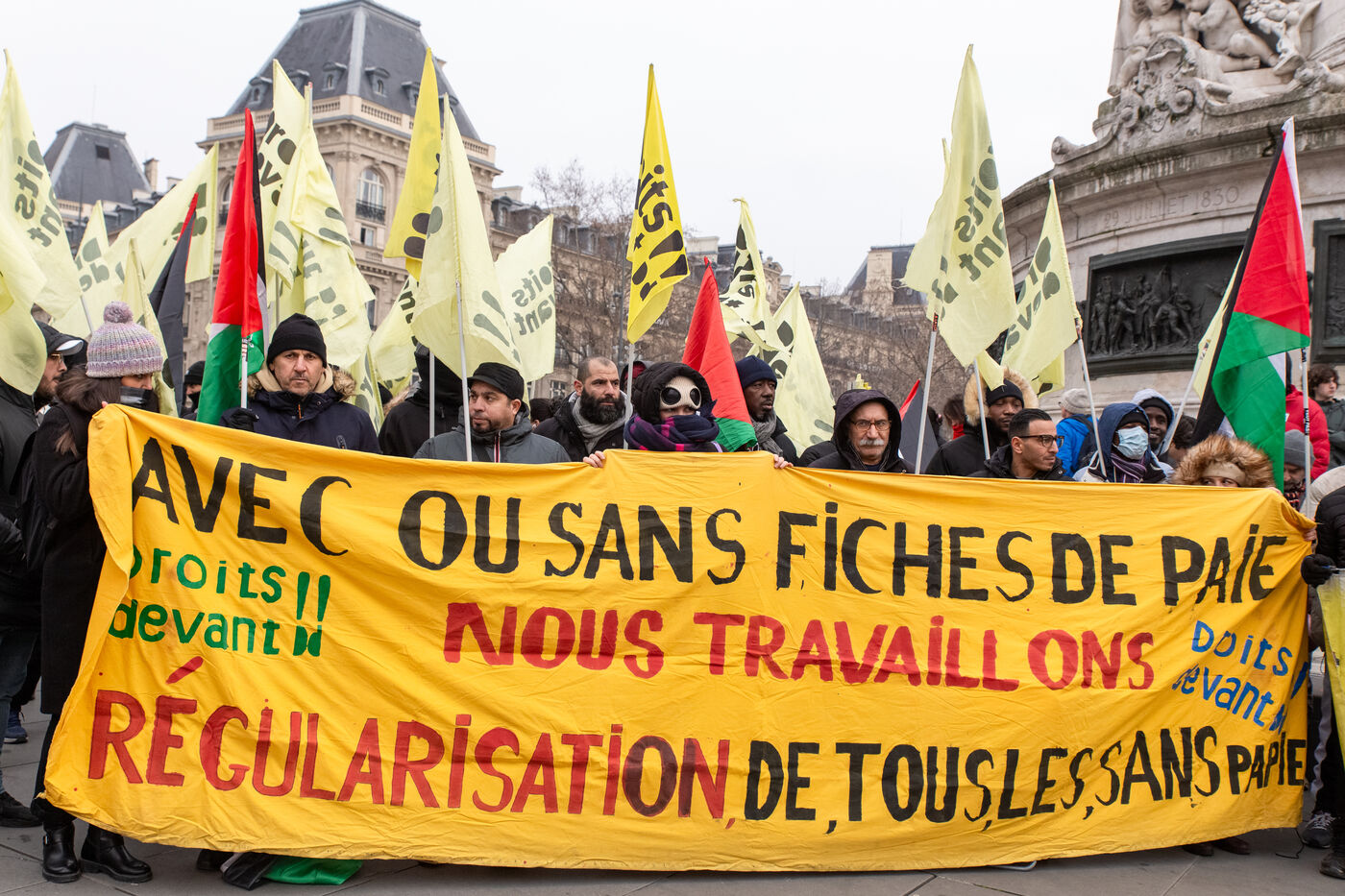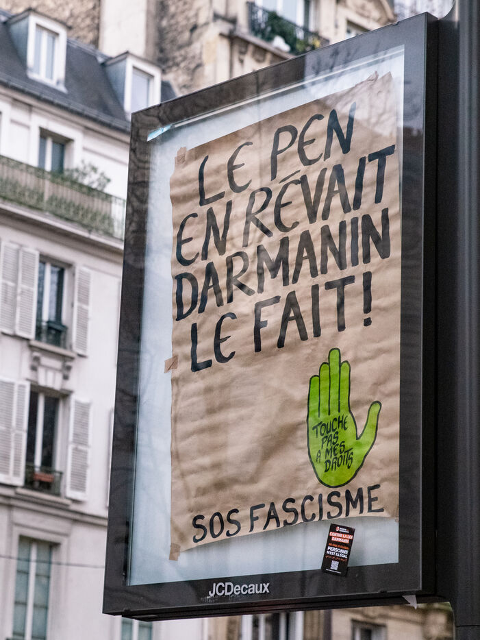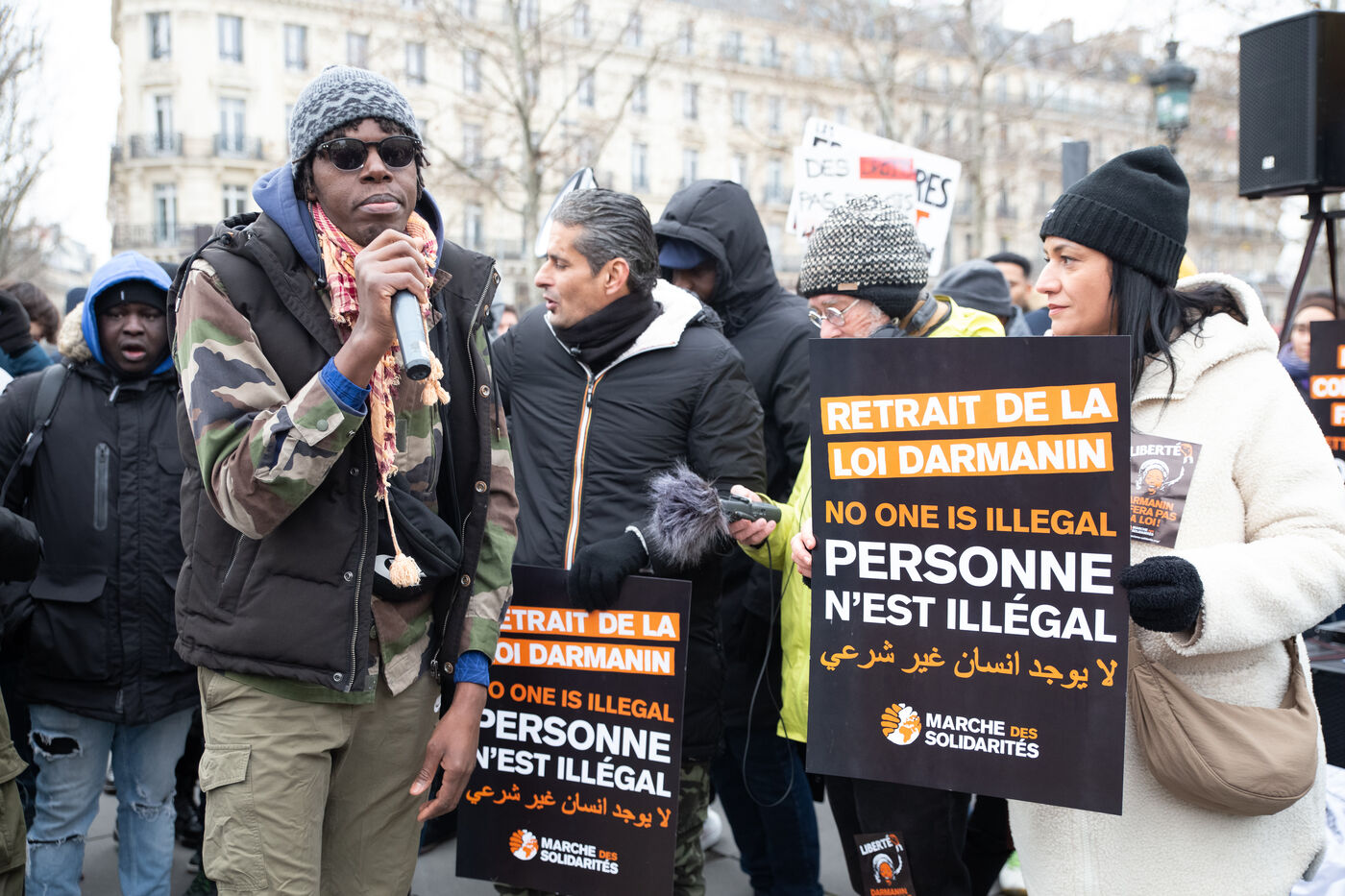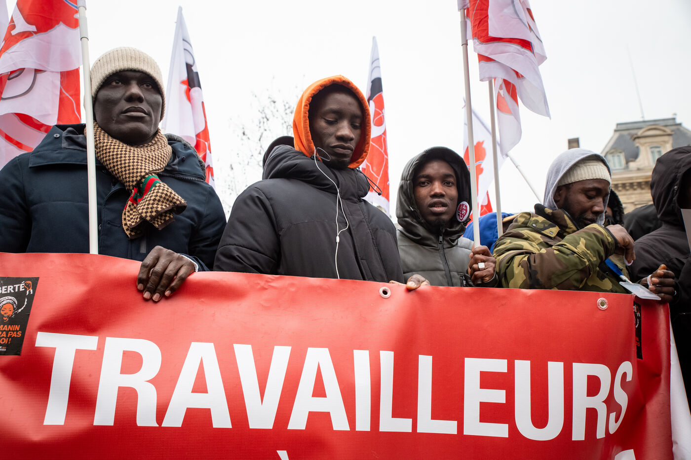 France, Paris, 14 January 2024. Demonstration in Paris against the Asylum and Immigration Bill, known as the Darmanin Bill, which provides for migration quotas, tougher rules on family reunification and access to certain benefits, as well as measures on integration, residence and asylum applications. Adopted at the end of December 2023, the bill is currently being examined by the Constitutional Council.