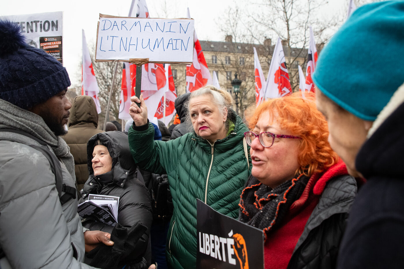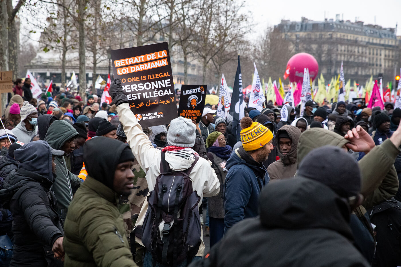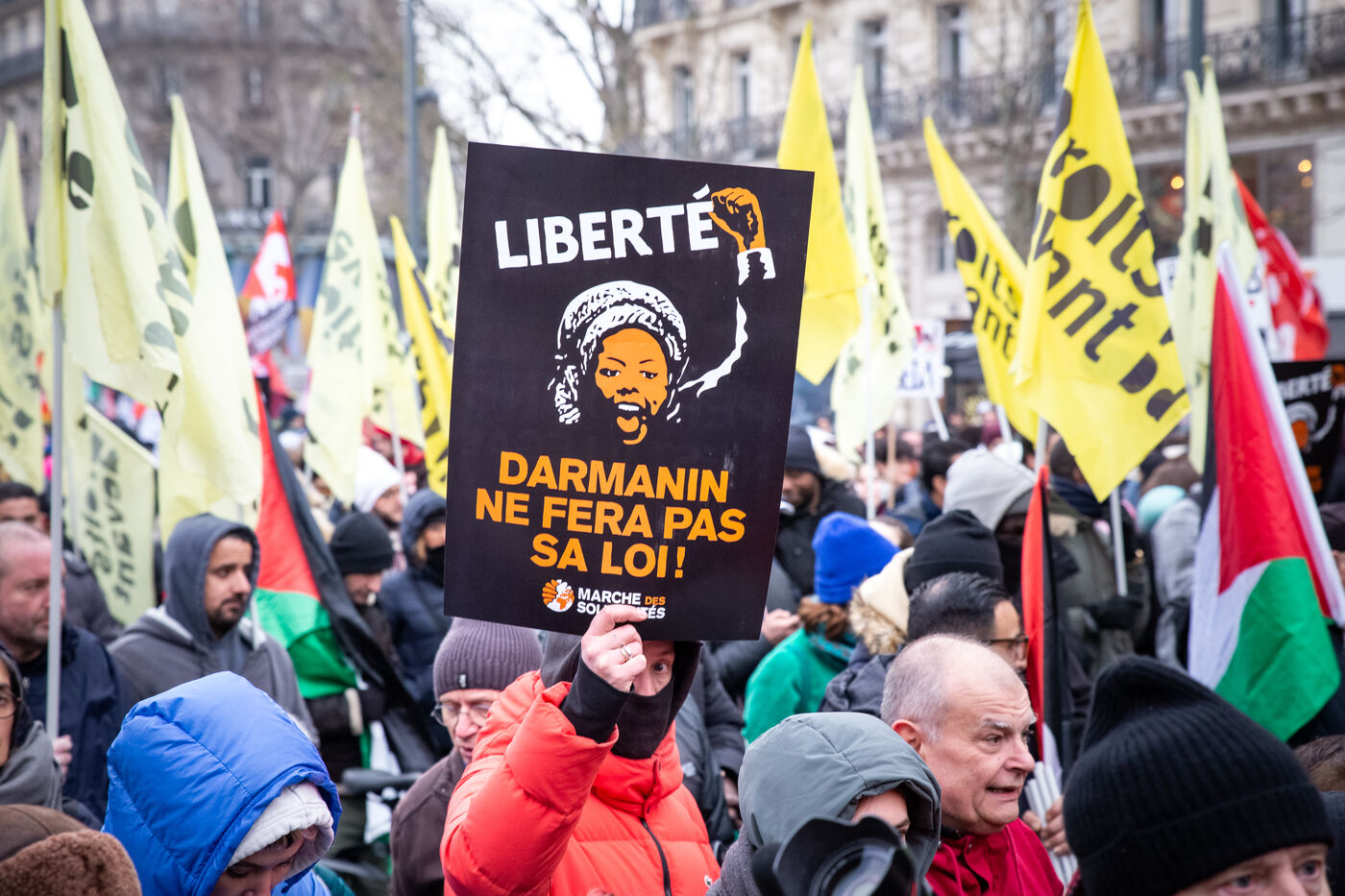 France, Paris, le 14 janvier 2024. Manifestation parisienne contre la loi asile immigration, dite loi Darmanin, qui prevoit notamment quotas migratoires, durcissement du regroupement familial et d?acces a certaines allocations, ainsi que des mesures sur l integration, le sejour et les demandes d asile. Adopté fin décembre 2023 le projet de loi est en cours d?examen au Conseil Constitutionnel.