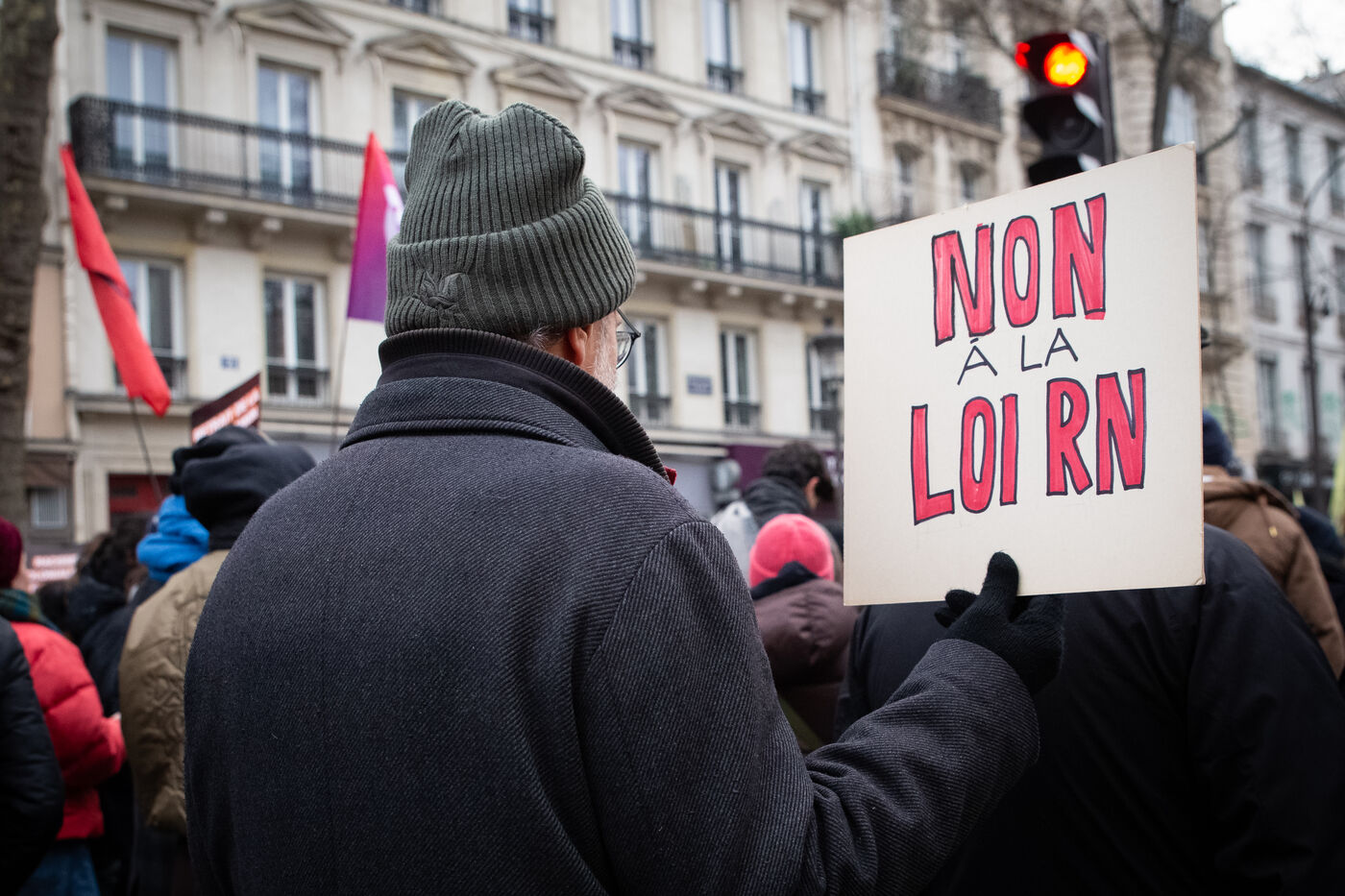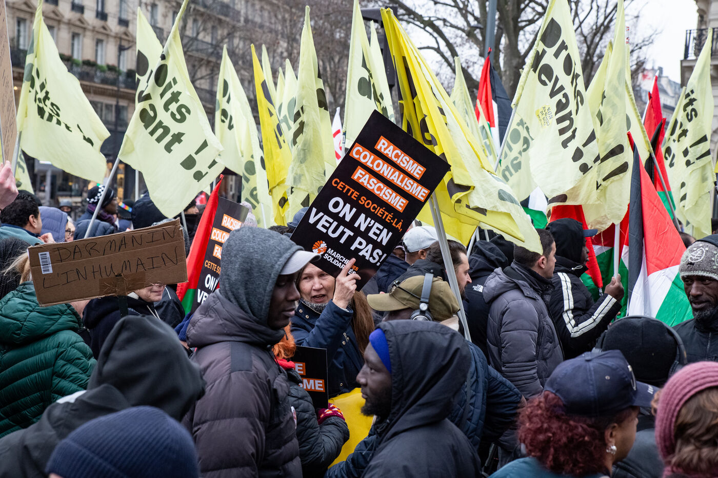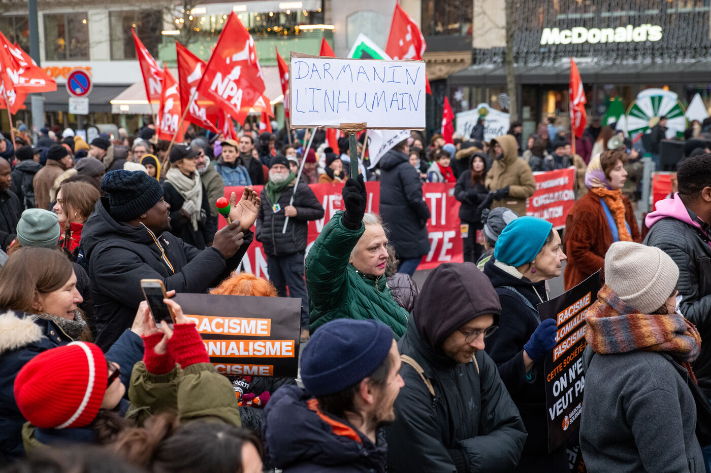 France, Paris, le 14 janvier 2024. Manifestation parisienne contre la loi asile immigration, dite loi Darmanin, qui prevoit notamment quotas migratoires, durcissement du regroupement familial et d?acces a certaines allocations, ainsi que des mesures sur l integration, le sejour et les demandes d asile. Adopté fin décembre 2023 le projet de loi est en cours d?examen au Conseil Constitutionnel.