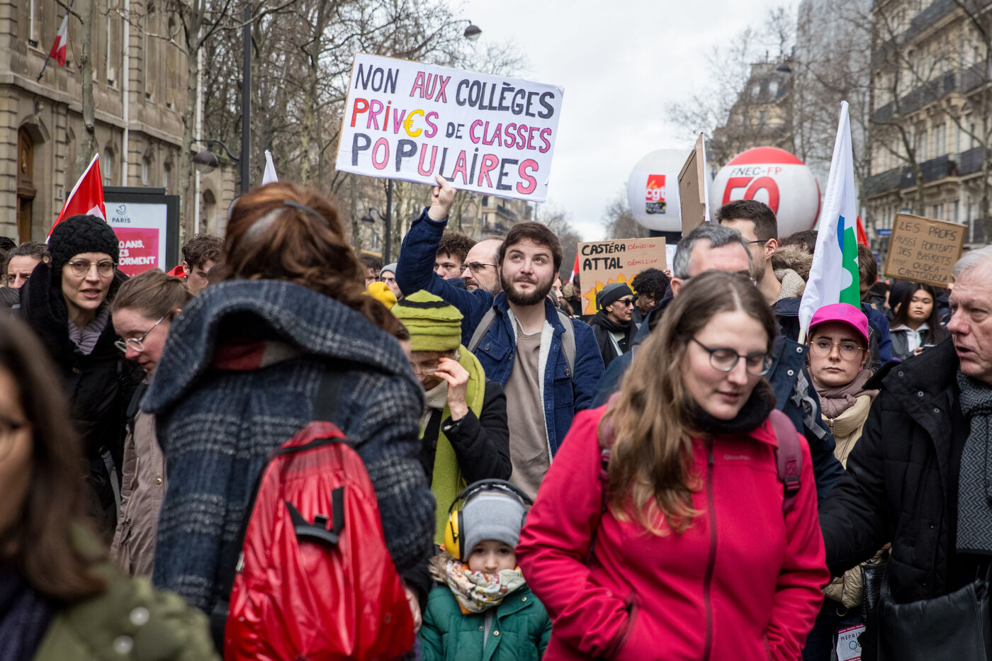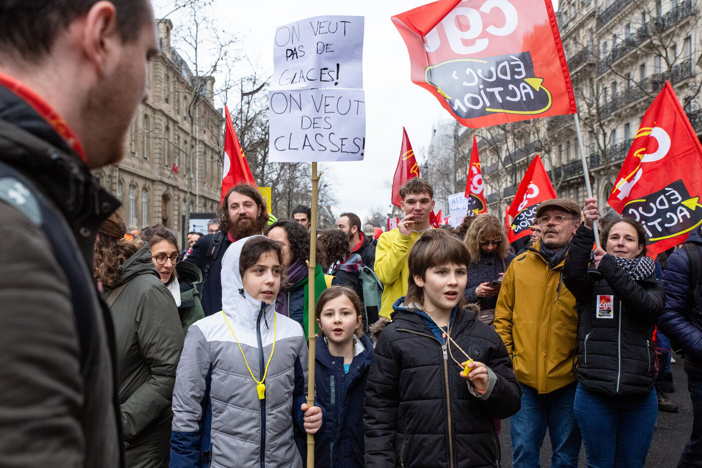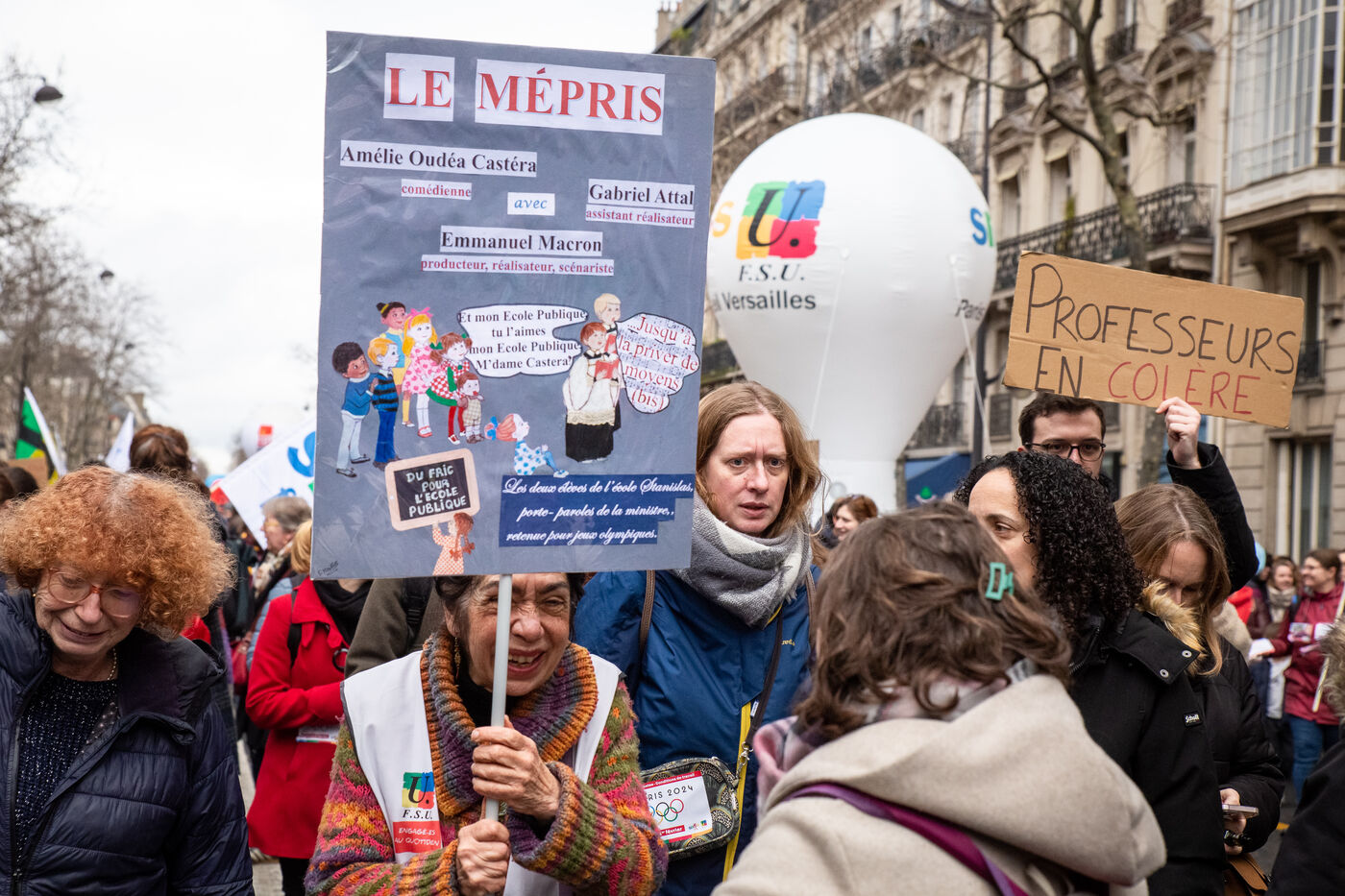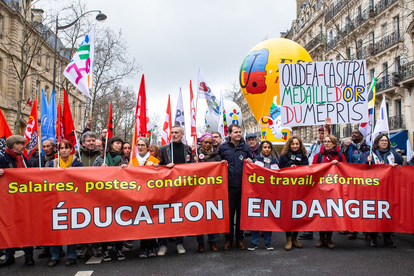 France, Paris, le 1ier fevrier 2024. Manifestation des enseignants, professeurs de l ecole publique et personnels de l Education nationale contre la politique du gouvernement et contre la ministre de l education nationale Amelie Oudea-Castera.