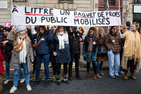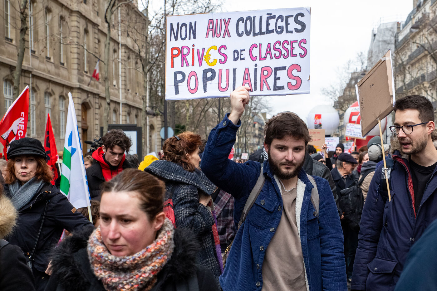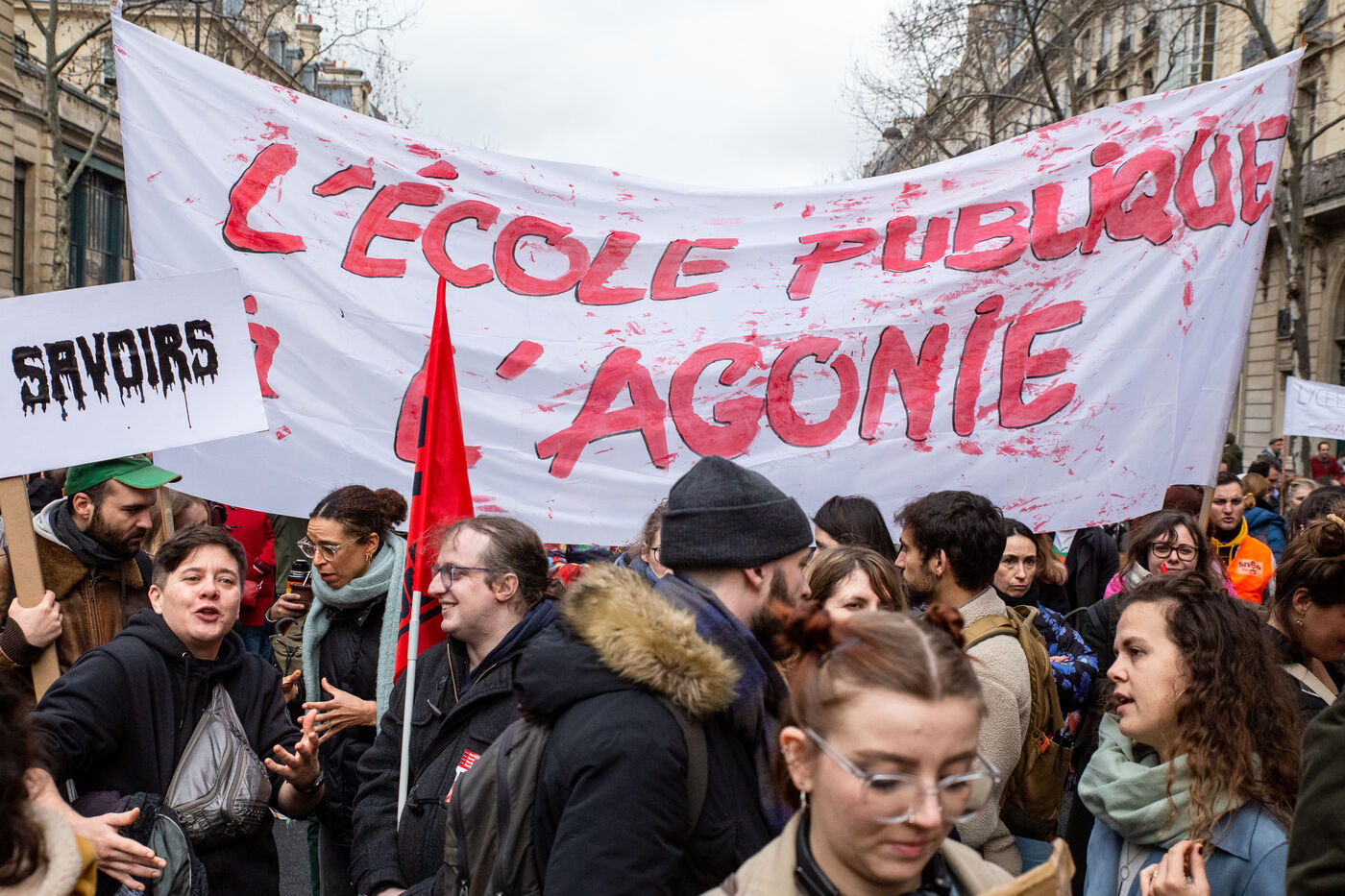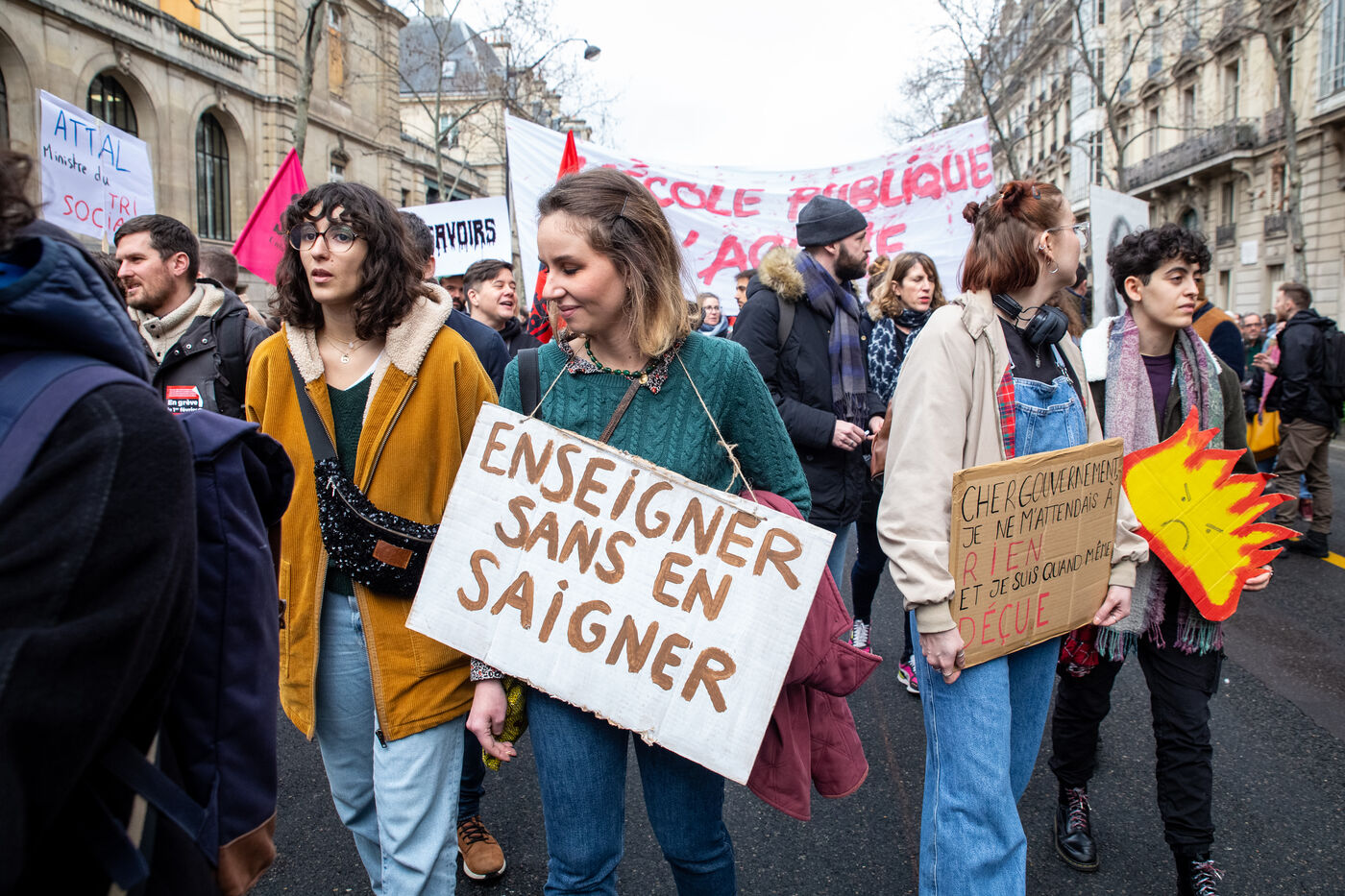 France, Paris, le 1ier fevrier 2024. Manifestation des enseignants, professeurs de l ecole publique et personnels de l Education nationale contre la politique du gouvernement et contre la ministre de l education nationale Amelie Oudea-Castera.