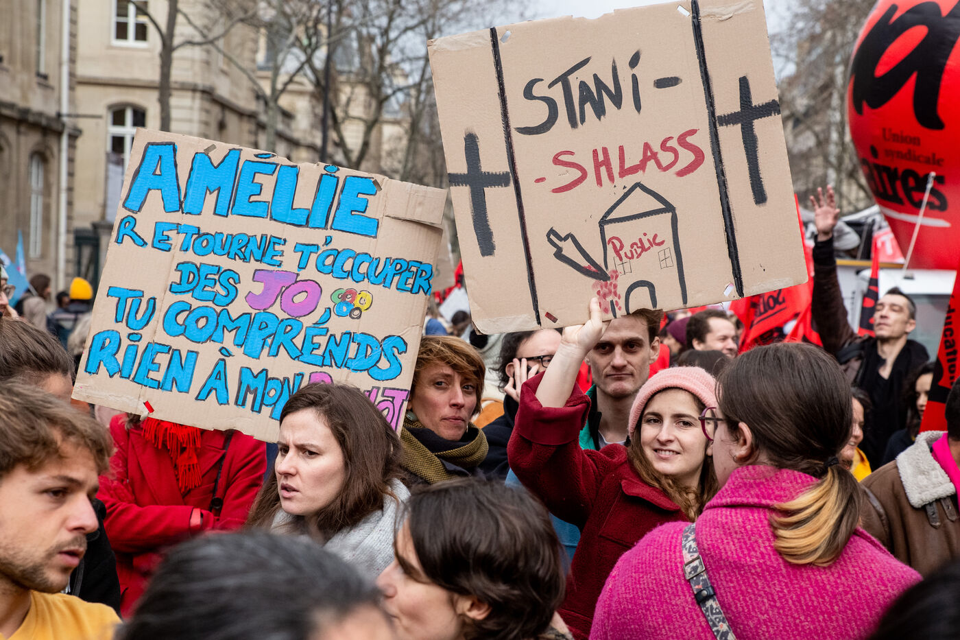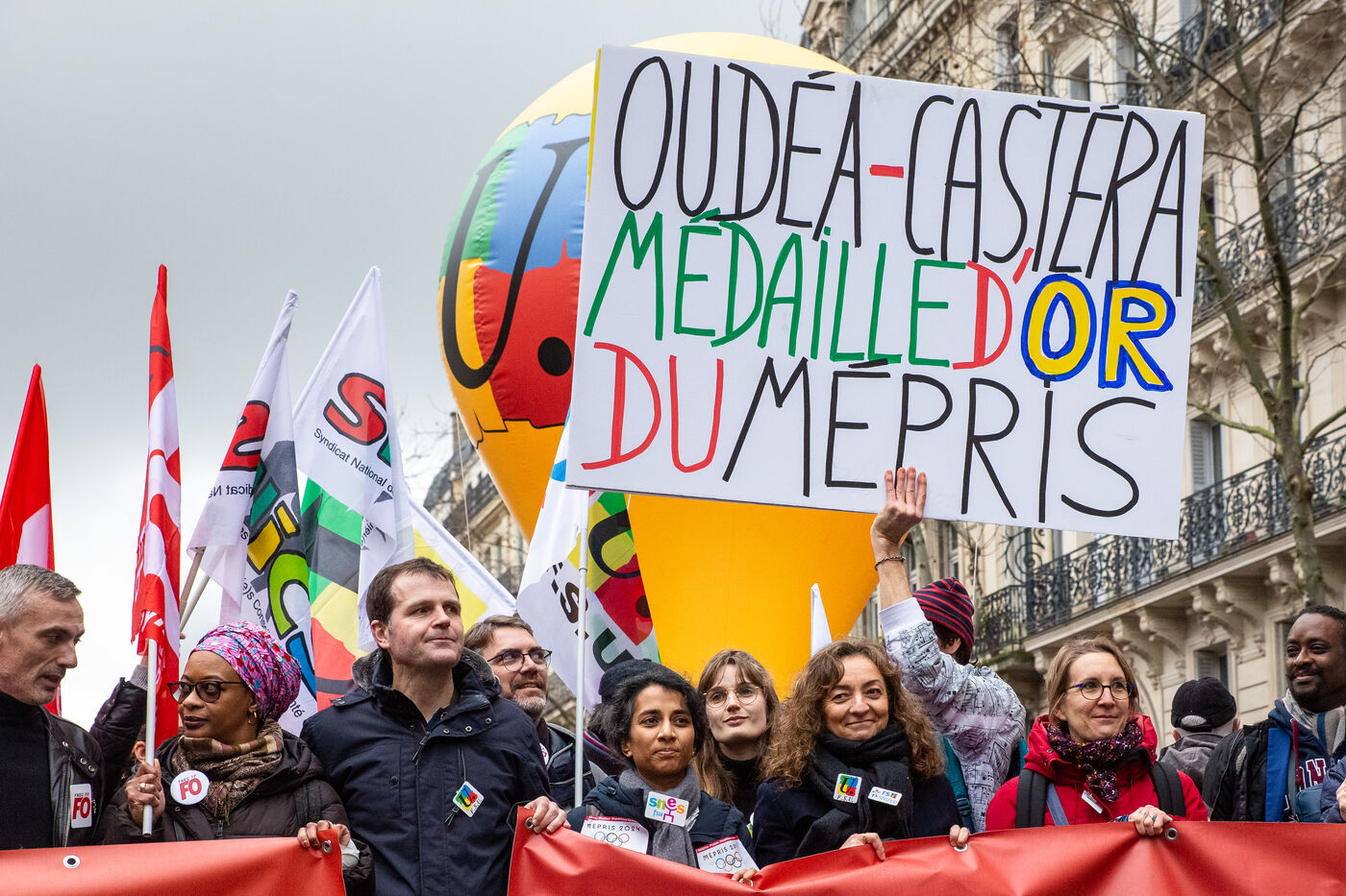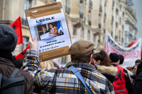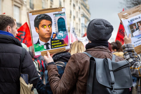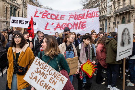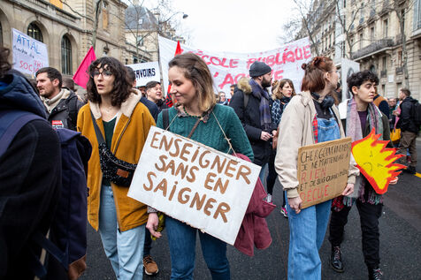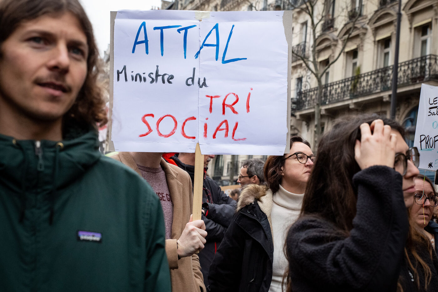 France, Paris, 1st February 2024. Demonstration by teachers, state schoolteachers and national education staff against the government's policies and the Minister of National Education, Amelie Oudea-Castera.
