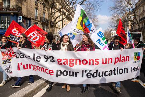 France, Paris, le 7 mars 2024. Manifestation a Paris des enseignants, assistants d education, parents d eleves et eleves de la Seine-Saint-Denis. A l appel de l intersyndicale (FSU, CGT Educ?action, SUD éducation, CNT), ils reclament un plan d urgence pour le departement le plus pauvre de France et protestent contre les groupes de niveaux. Alertant sur l etat d insalubrite des etablissements scolaires, ils demandent plus de moyens humains et financiers.