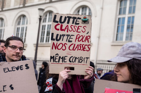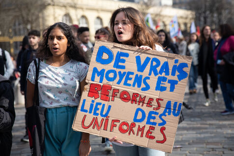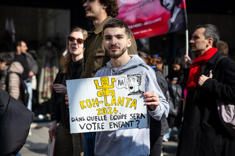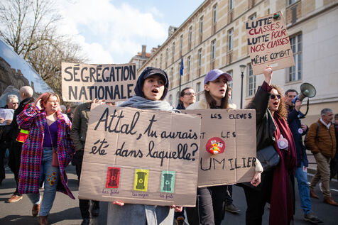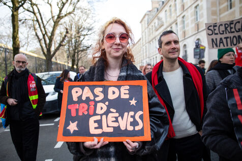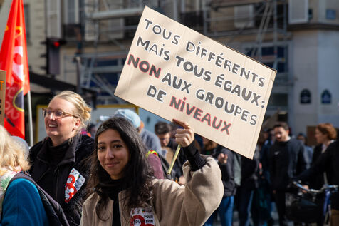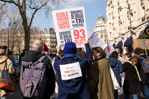 France, Paris, 7 March 2024. Demonstration in Paris by teachers, education assistants, parents and pupils from Seine-Saint-Denis. Calling for an emergency plan for France's poorest department, they are protesting against the use of streaming. Pointing out that schools are in an unhealthy state, they are calling for more human and financial resources.