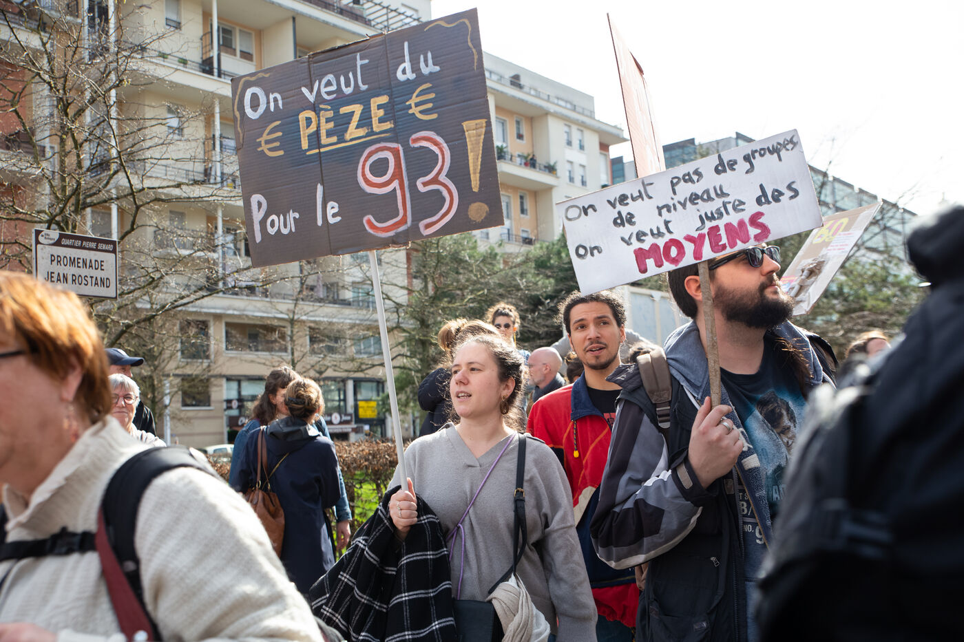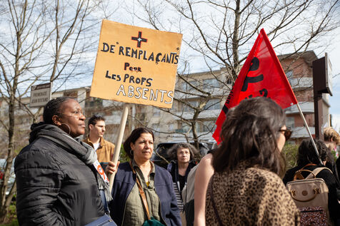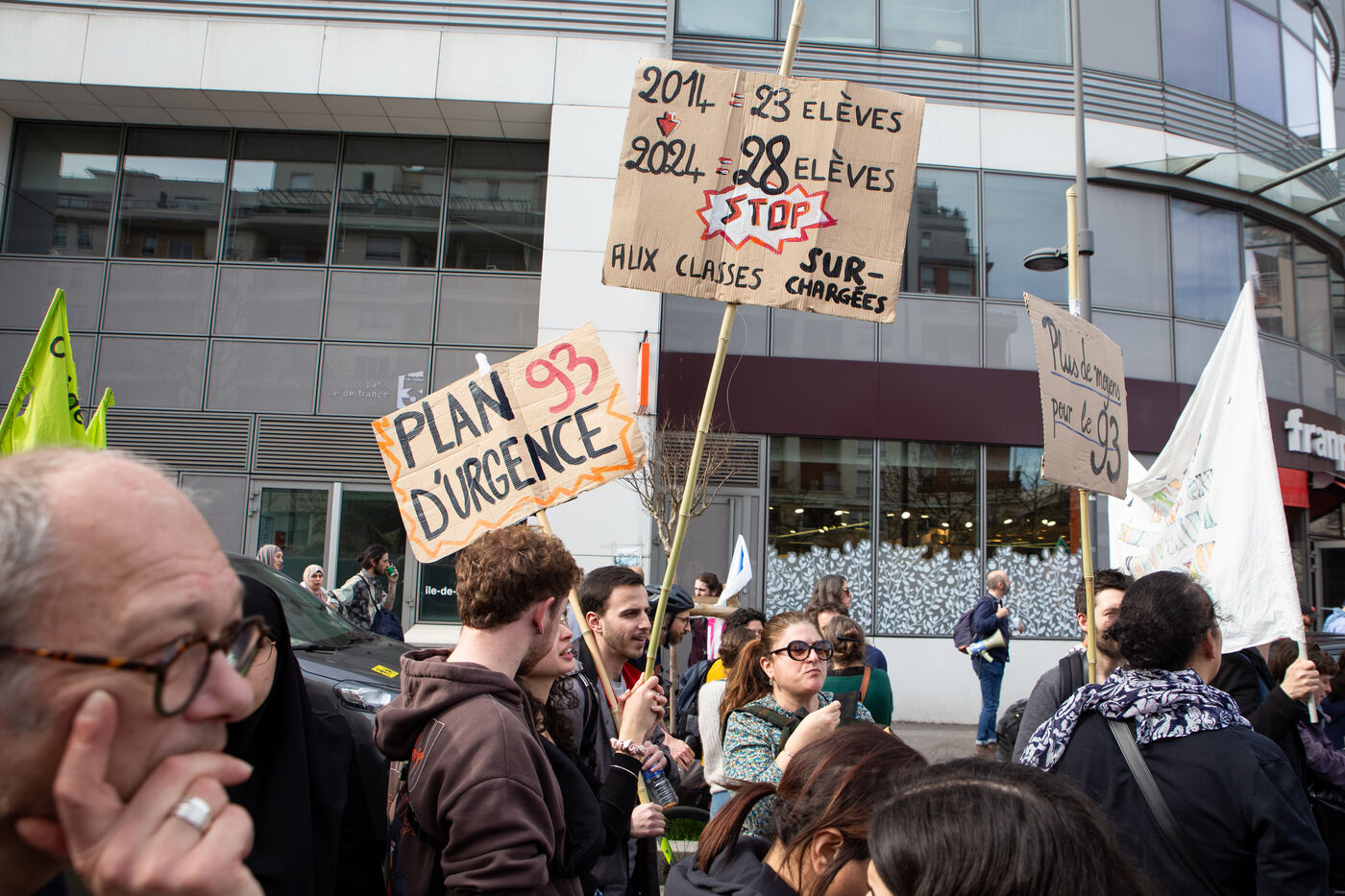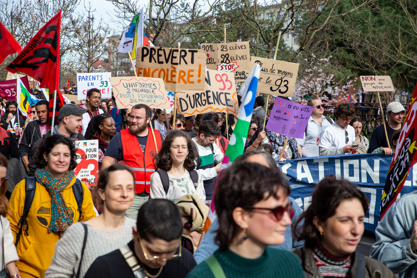 France, Bobigny, 14 March 2024. Rally in front of the DSDEN (Direction des services départementaux de l'Éducation nationale) in Bobigny. Various processions of teachers, education assistants, parents and pupils demonstrated on Thursday across Seine-Saint-Denis and converged on the prefecture to demand an emergency plan for the department's state schools. Following the call of the joint trade union (FSU, CGT Educ'action, SUD éducation, CNT), they demanded more human and financial resources and rejected the introduction of grade groups.
