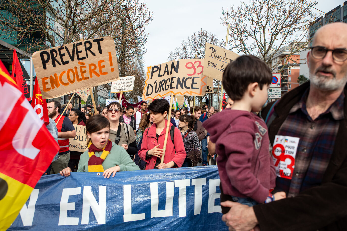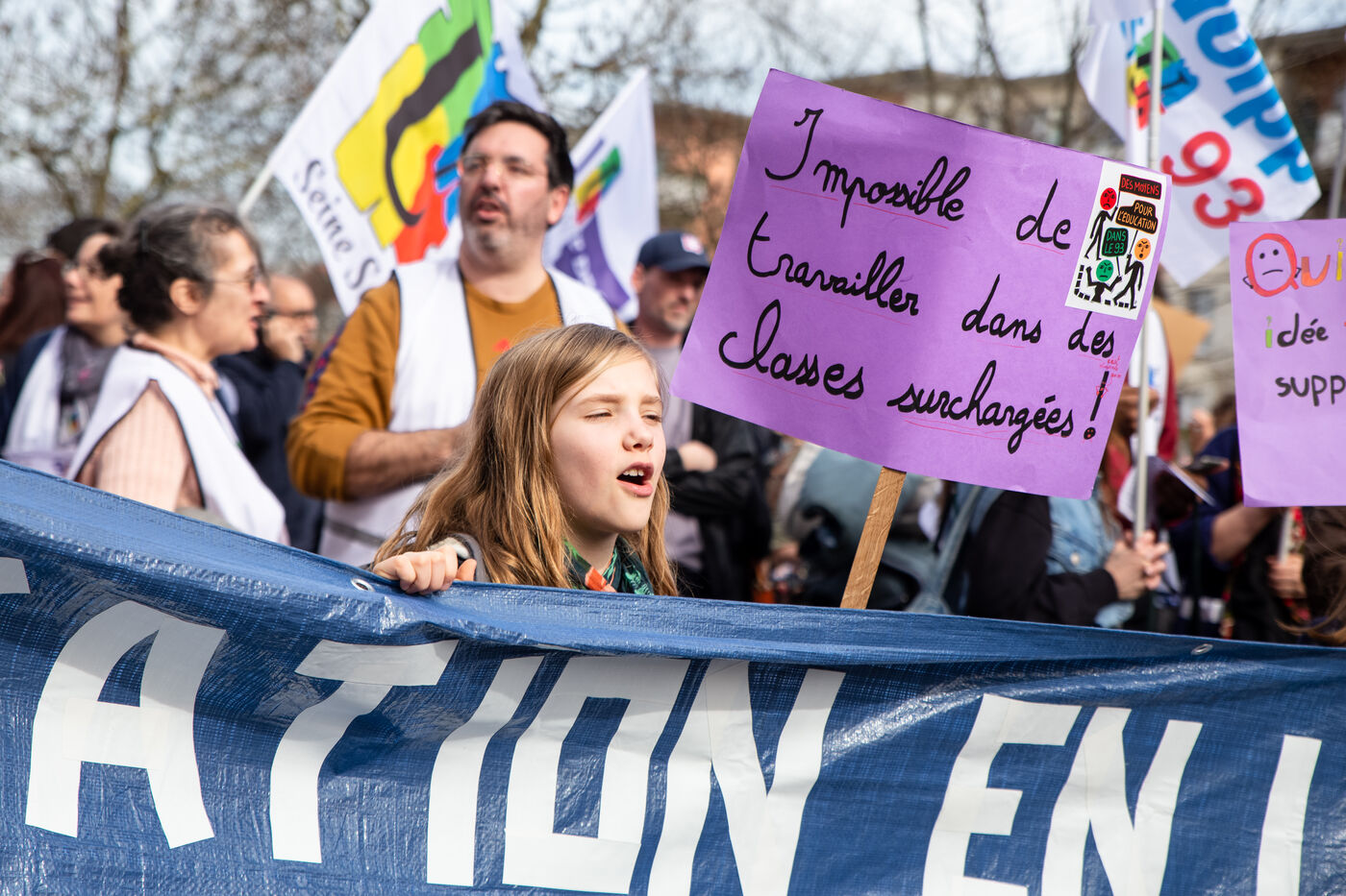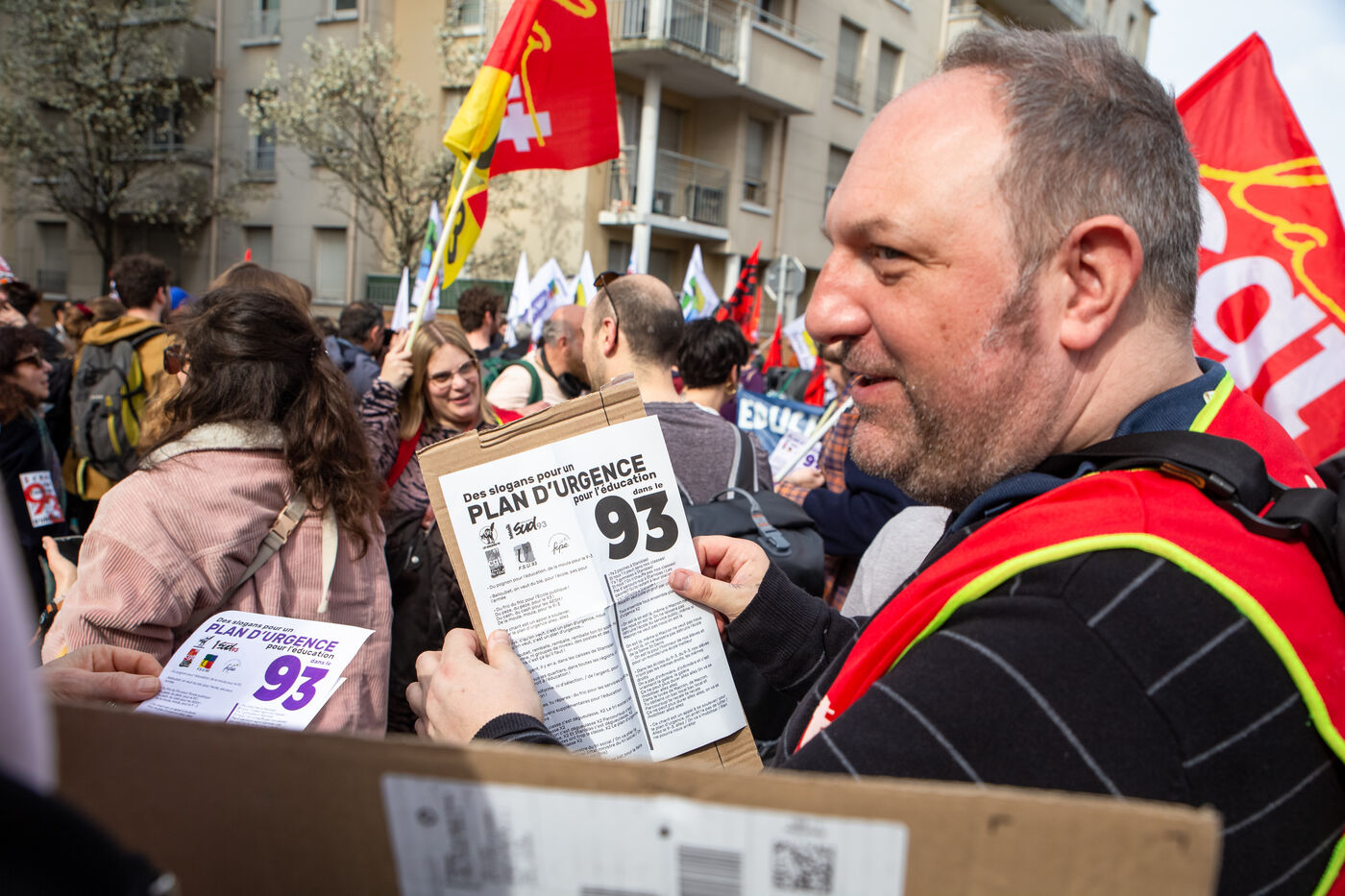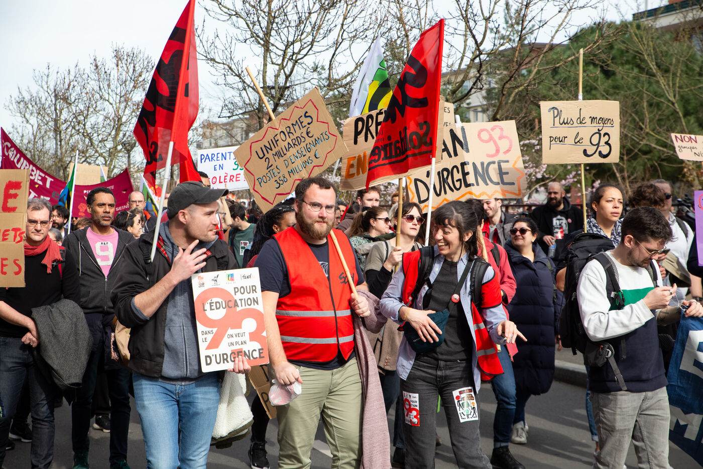France, Bobigny, 14 March 2024. Rally in front of the DSDEN (Direction des services départementaux de l'Éducation nationale) in Bobigny. Various processions of teachers, education assistants, parents and pupils demonstrated on Thursday across Seine-Saint-Denis and converged on the prefecture to demand an emergency plan for the department's state schools. Following the call of the joint trade union (FSU, CGT Educ'action, SUD éducation, CNT), they demanded more human and financial resources and rejected the introduction of grade groups.