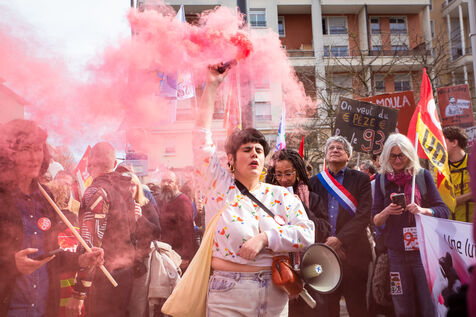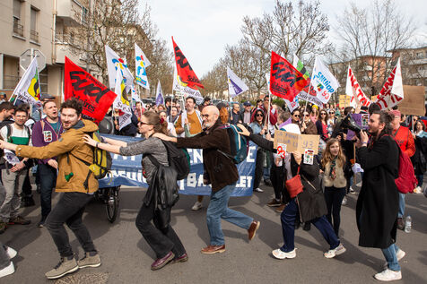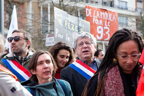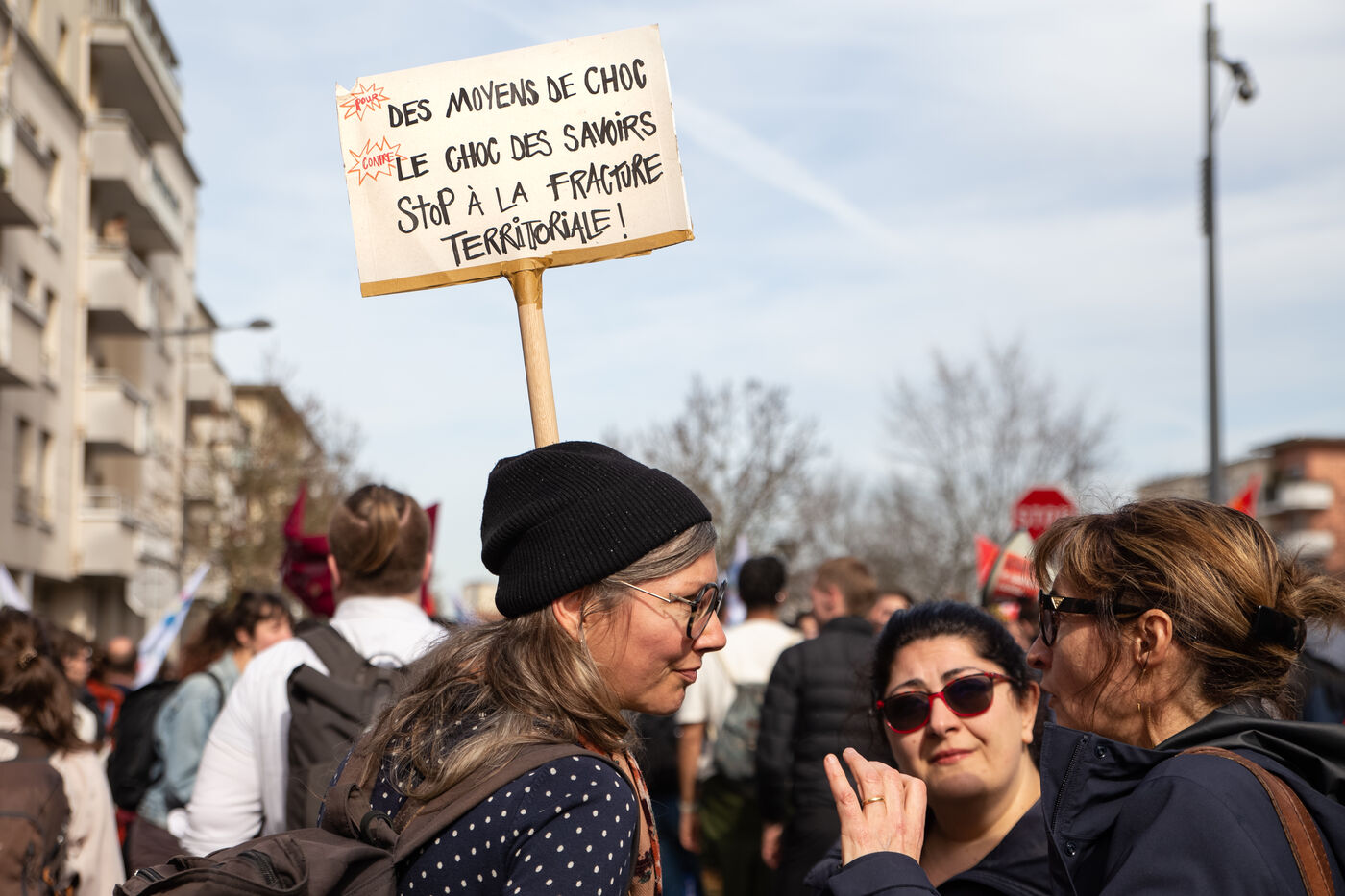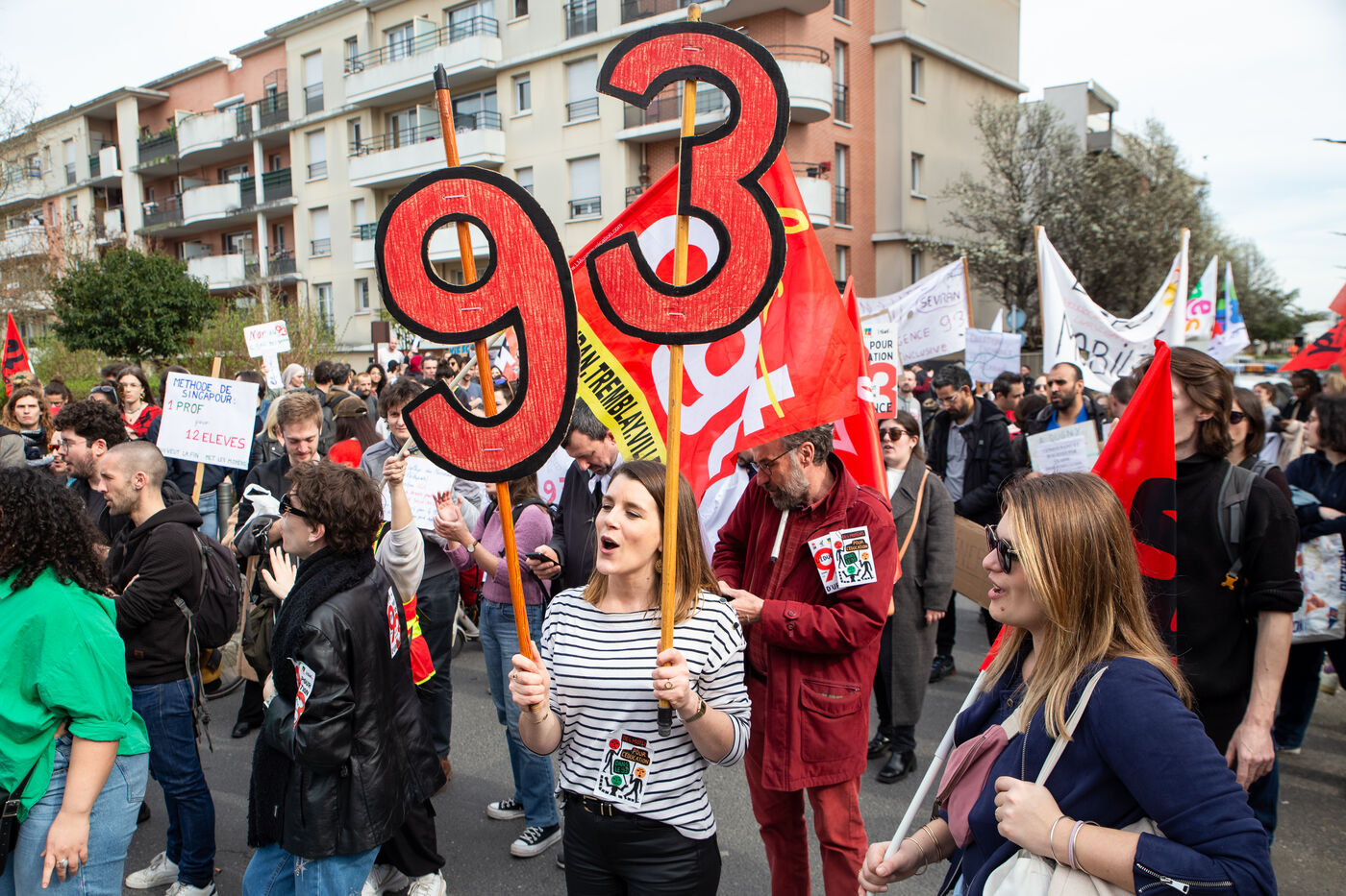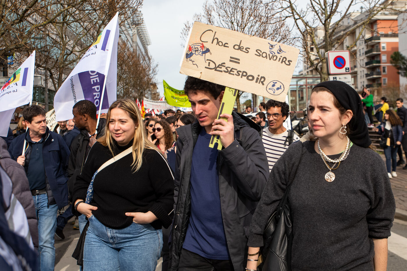 France, Bobigny, 14 March 2024. Rally in front of the DSDEN (Direction des services départementaux de l'Éducation nationale) in Bobigny. Various processions of teachers, education assistants, parents and pupils demonstrated on Thursday across Seine-Saint-Denis and converged on the prefecture to demand an emergency plan for the department's state schools. Following the call of the joint trade union (FSU, CGT Educ'action, SUD éducation, CNT), they demanded more human and financial resources and rejected the introduction of grade groups.