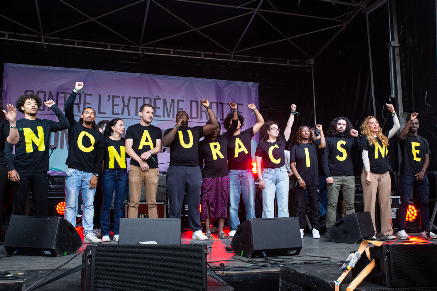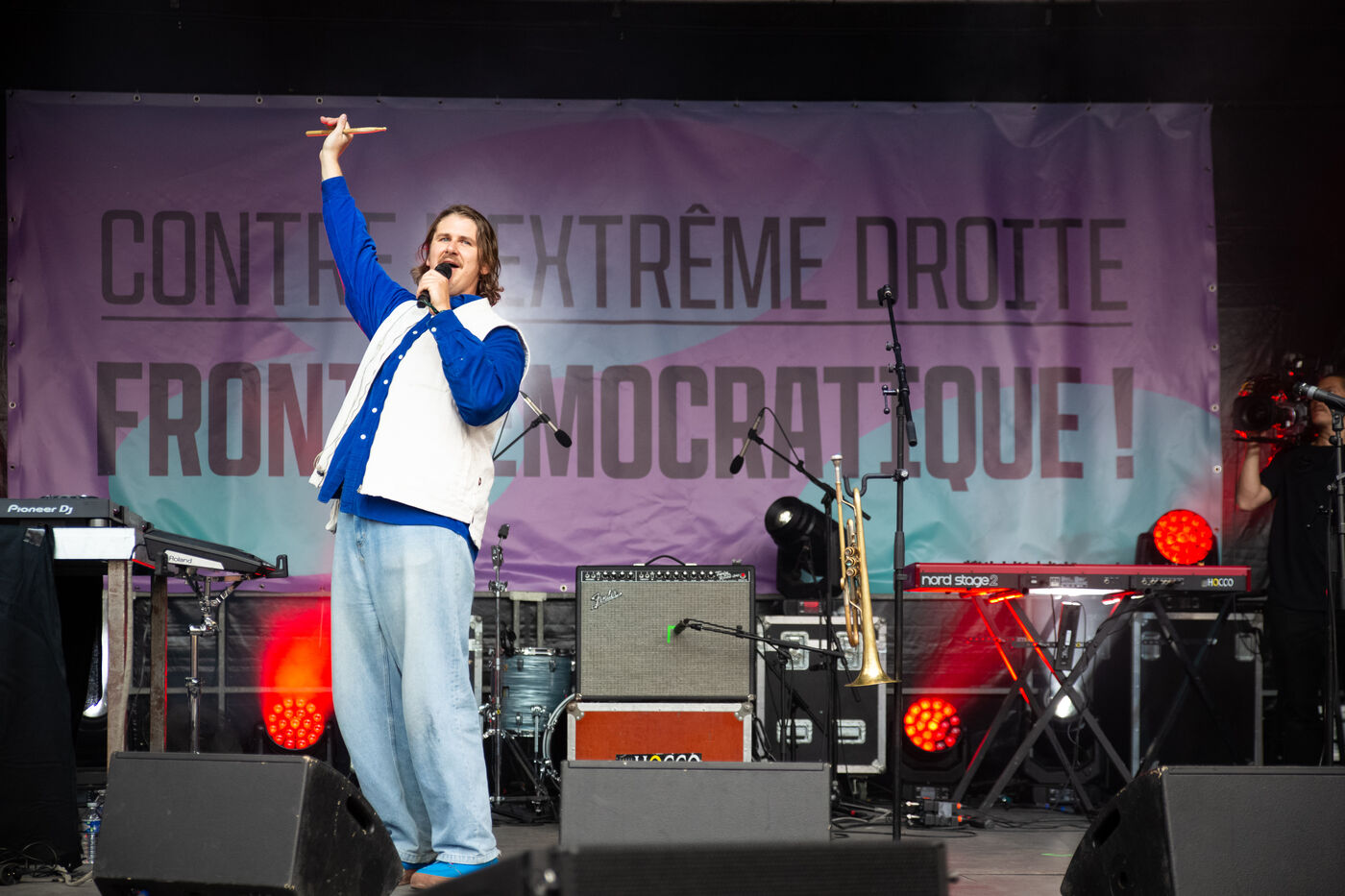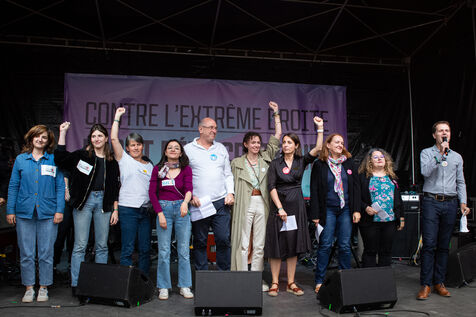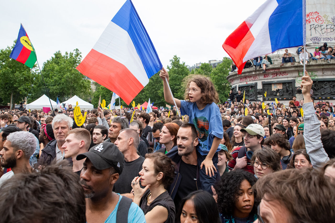 FRANCE, Paris, Place de la République, le 3 juillet 2024. Rassemblement pour un Front democratique contre l extreme droite organise par une centaines de medias independants, d associations et de syndicats, quatre jours avant le deuxieme tour des elections legislatives anticipees.