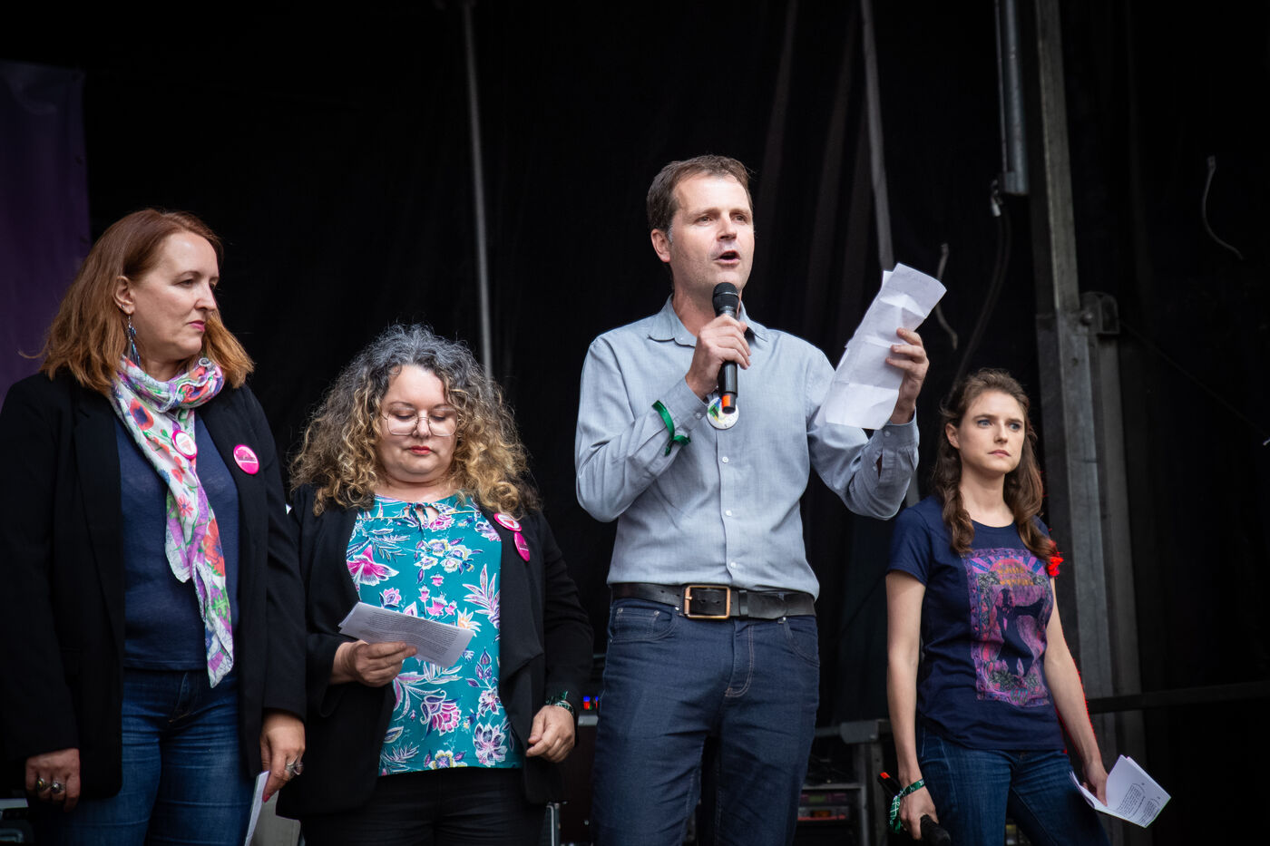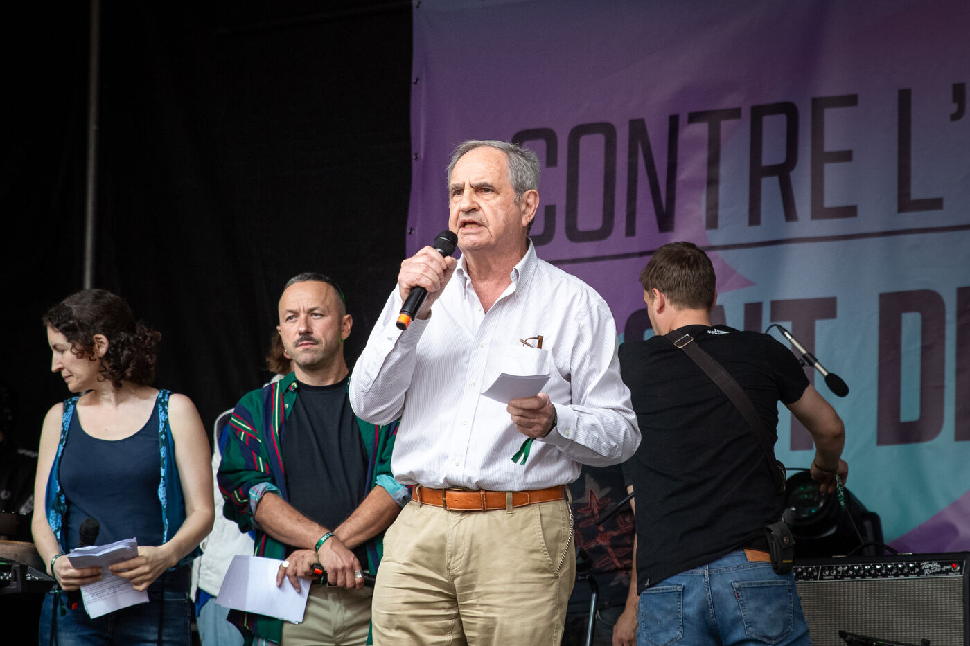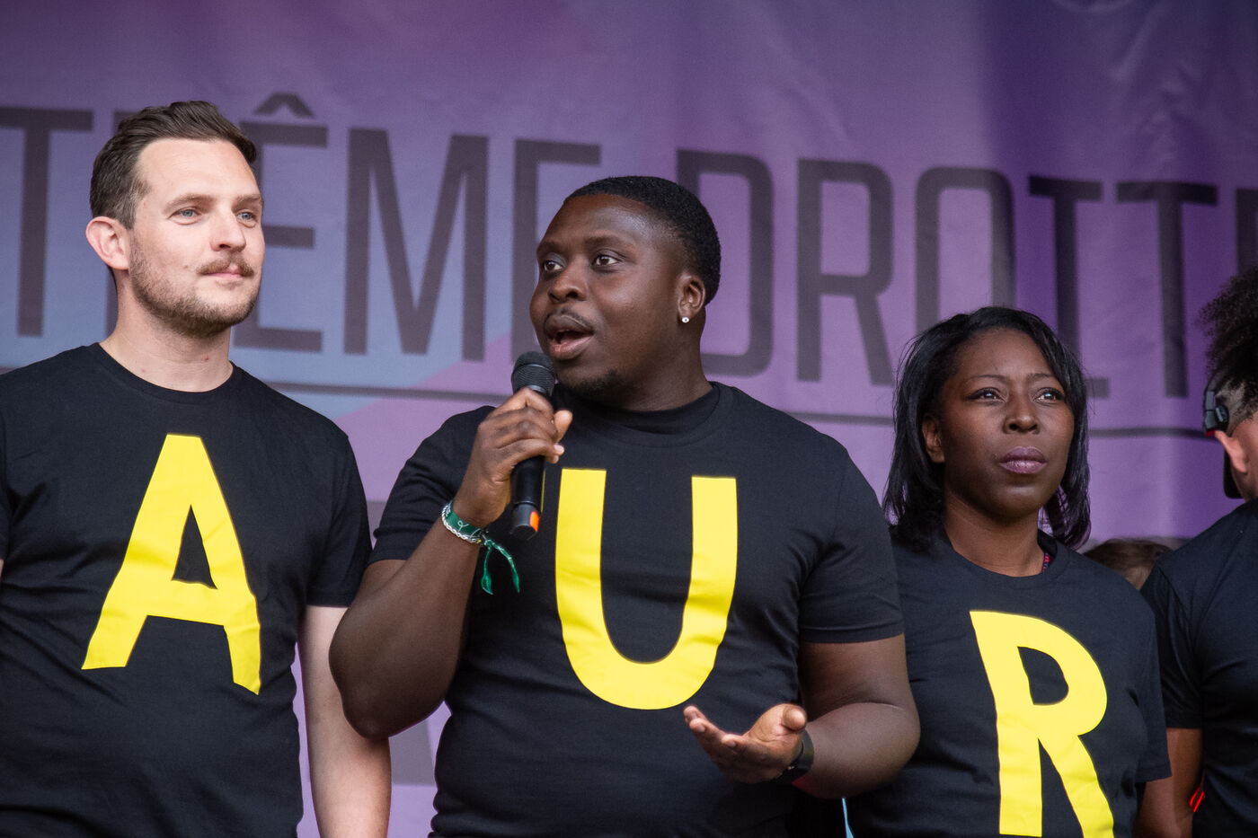 FRANCE, Paris, Place de la République, le 3 juillet 2024. Rassemblement pour un Front democratique contre l extreme droite organise par une centaines de medias independants, d associations et de syndicats, quatre jours avant le deuxieme tour des elections legislatives anticipees.
