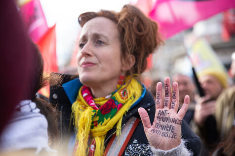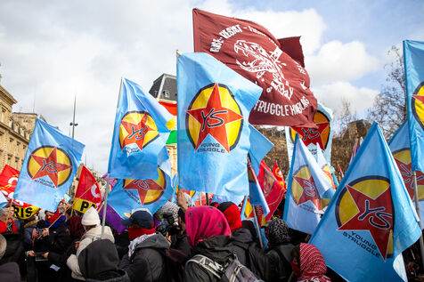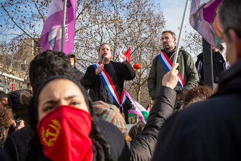 FRANCE, Paris, le 22 Fevrier 2025. Manifestation antifasciste a l appel de l Association Culturelle des Travailleurs Immigres de Turquie (ACTIT) et de Young Struggle, suite a une violente agression a l’arme blanche par des membres de l ultradroite. Militants antifascistes et sympathisants de gauche sont venus denoncer la brutalite de l extreme droite, le climat de violence et de xénophobie actuel. Ils ont voulu tenir la rue pour que les fascistes n y fassent pas leur loi.