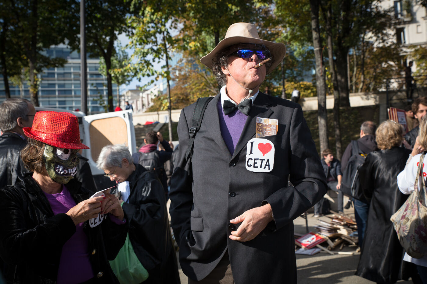 France, Paris, samedi 15 Octobre 2016. Plusieurs milliers de personnes ont manifesté à Paris pour dénoncer le projet d'accord de libre-échange entre l'Union européenne et le Canada, le CETA, qui a succédé au TAFTA, projet avec les Etats-Unis lui aussi décrié. La signature du CETA doit avoir lieu le 27 octobre.