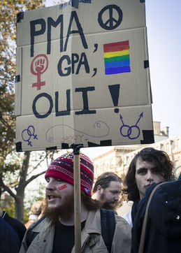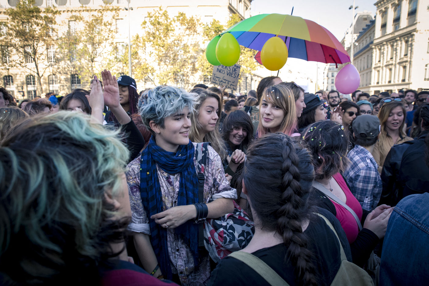 While the "manif pour tous" is taking place at the Trocadéro palace, a KissIN (people kissing each other in a public place) is happening at the same time Place de la République, in Paris, the 16th october 2016.