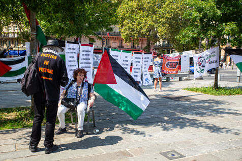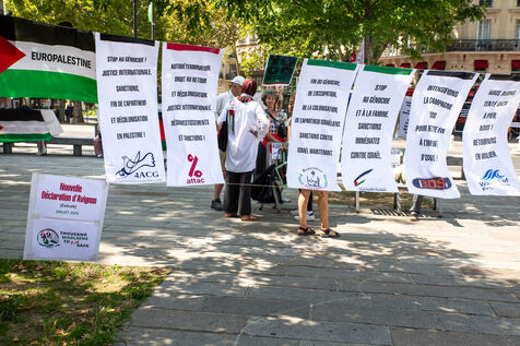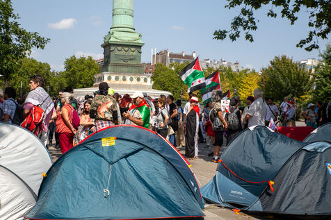 France, Paris, August 9, 2025. Several dozen activists in solidarity with the Palestinian people have set up a camp on Place de la Bastille to demand sanctions against the genocidal Israeli regime. Organized by the French Jewish Union for Peace (UJFP), this action brought together activists from several other organizations: EuroPalestine, LFI, AFPS, Attac, NPA, BDSFrance...