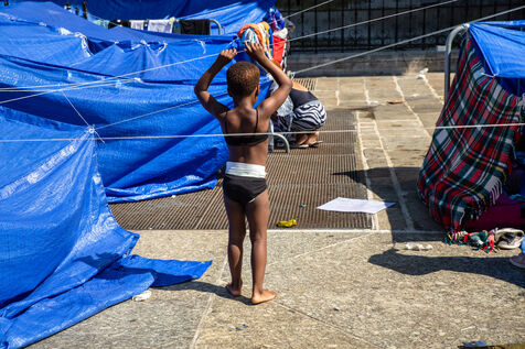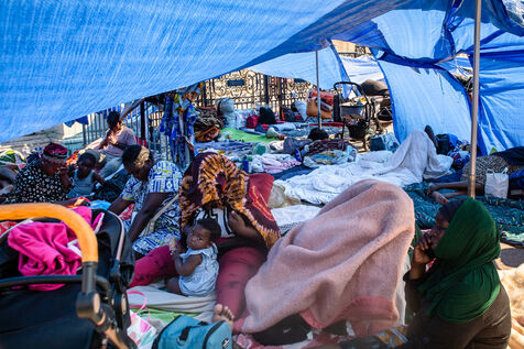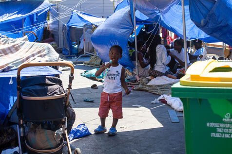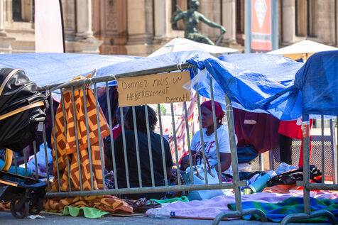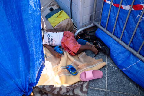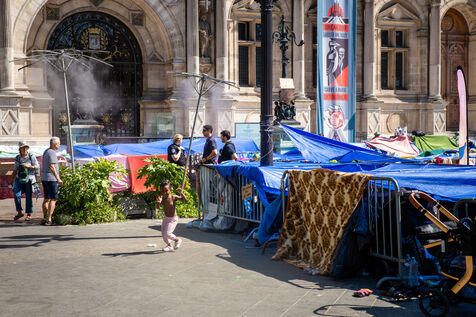 France, Paris, City Hall, August 11, 2025. More than 250 people, mostly families or single women with children, have been occupying the square in front of Paris City Hall for a week. With the help of the Utopia 56 association, they are camping in front of Paris City Hall to obtain decent emergency accommodation.